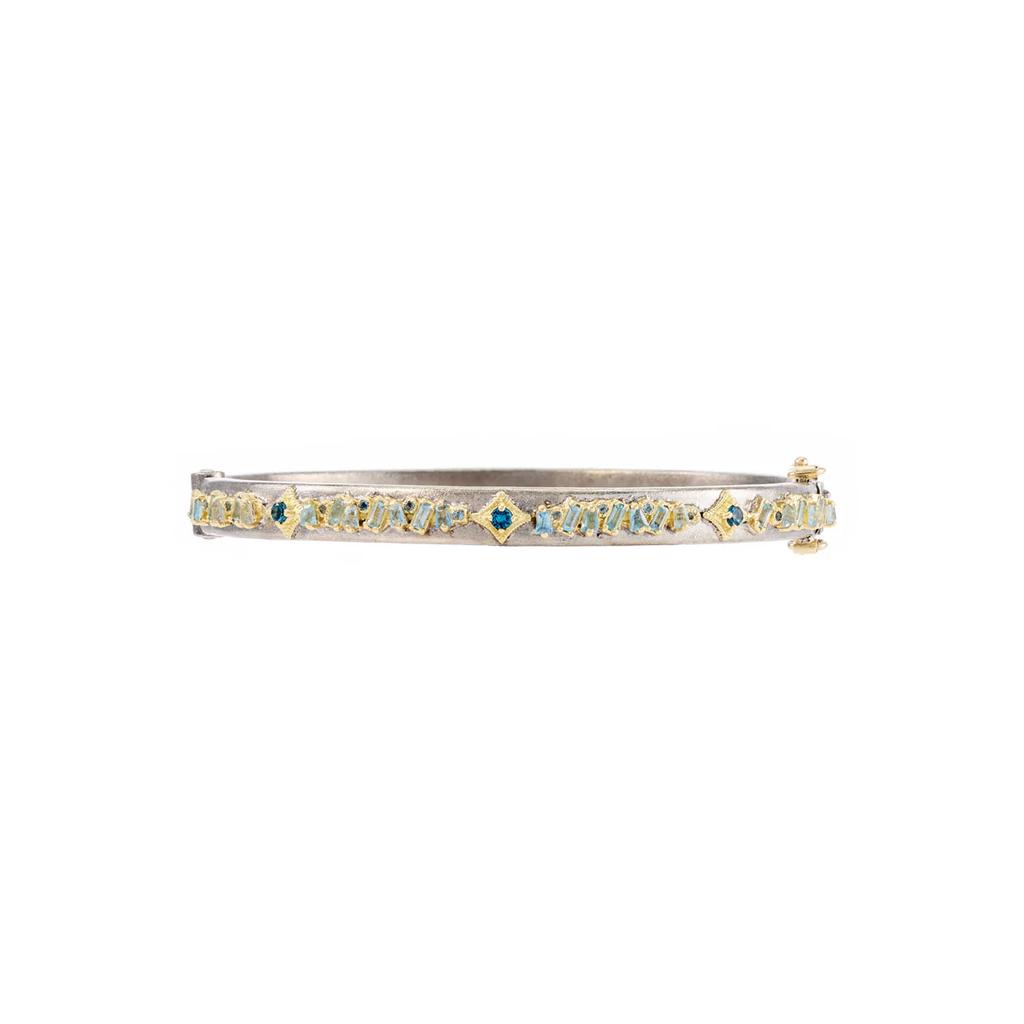 This bracelet features oxidized sterling silver with bezel set London Blue Topaz and Moss Aqua with alternating 18kt yellow gold crivelli designs with a hinged clasp.