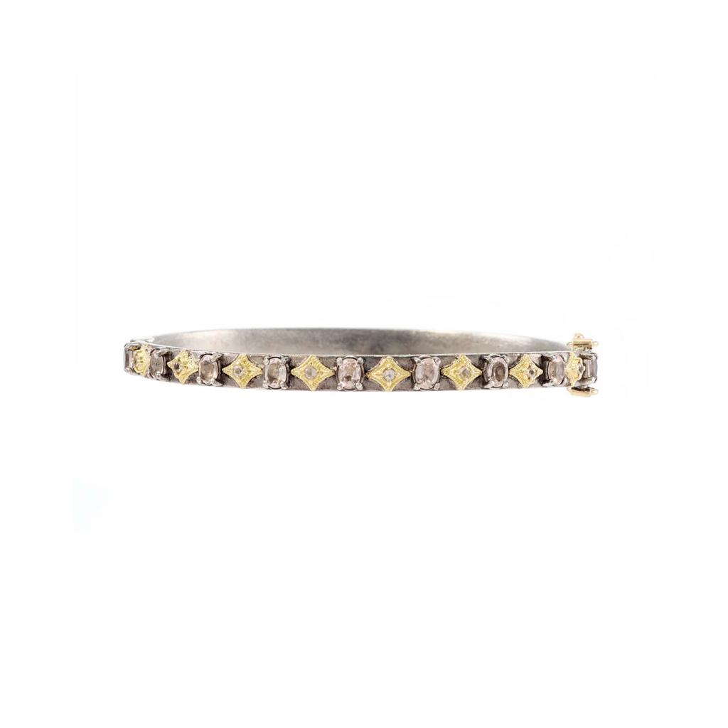 This bangle bracelet features oxidized sterling silver with bezel set Morganite with alternating18kt yellow gold crivelli designs with a hinged clasp.