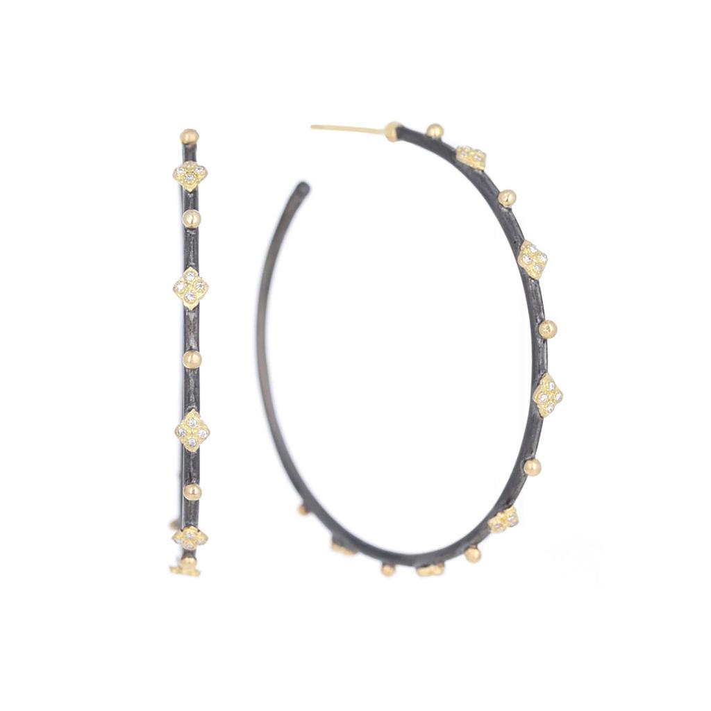 These post back earrings feature oxidized sterling silver hoop earrings with alternating pave white diamonds 18kt yellow gold Crivelli stations and gold dot beads. These earrings measure 55mm.
