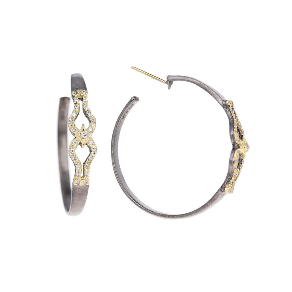 18kt Yellow Gold, Oxidized Sterling Silver, and White Diamond Hoop Earrings By Artist Emily Armenta.