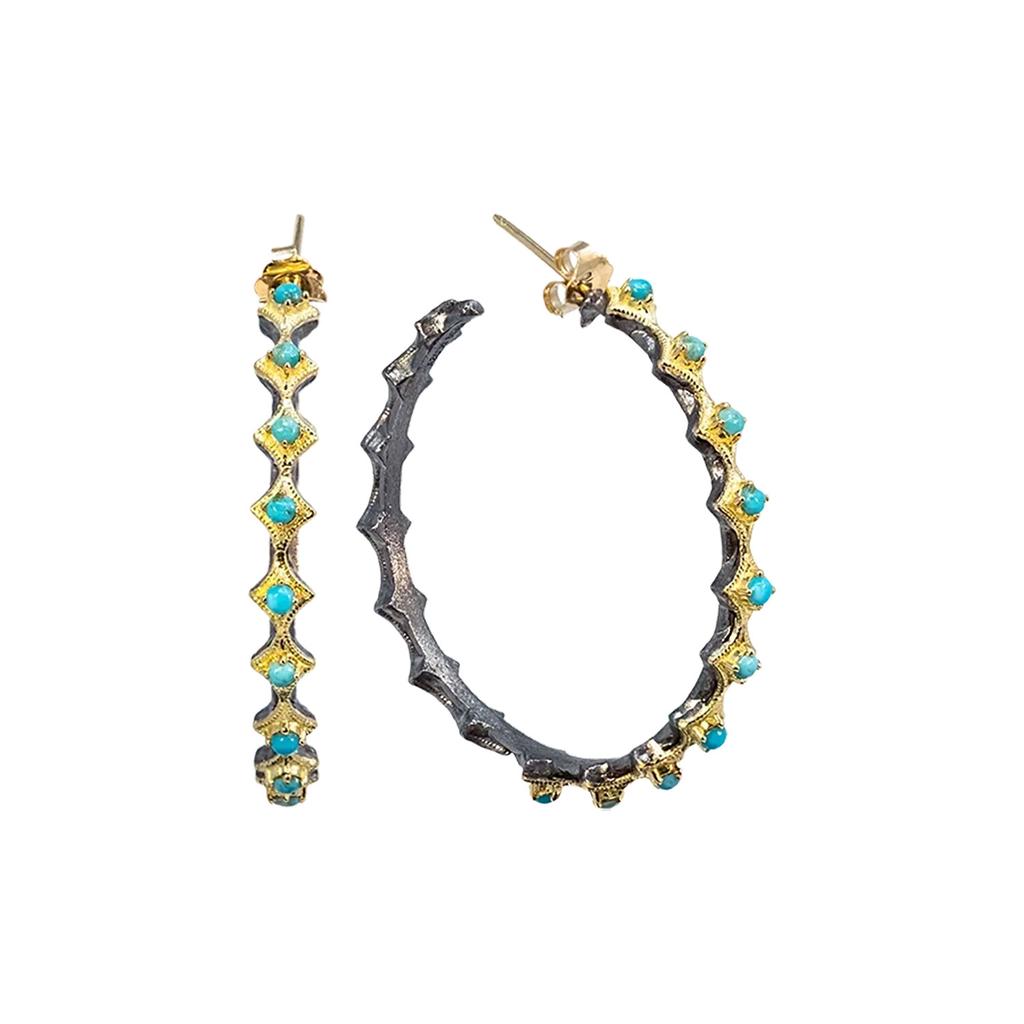 18kt Yellow Gold, Oxidized Sterling Silver, and Turquoise Crivelli Hoop Earrings By Artist Emily Armenta.