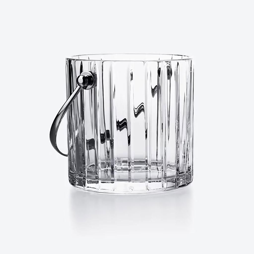 The Harmonie Clear crystal ice bucket has a stainless steel handle and features the sweep of vertical striping characteristic of the Harmonie barware collection. Parallel vertical lines travel cleanly along the silhouette from the lip to the thick base, the streamlined form like a thick Clear crystal column. The stripes are subtly yet precisely etched into the Clear crystal surface of the glass. Not only do they bring a textural quality, but they also create a depth of form that is visually resplendent—all the more so when the bucket is full of cold, glistening ice. The Harmonie collection of barware extends to highballs, tumblers, and both Round and Square Whiskey Decanters. All of these pieces complement a well-stocked bar for the smoothest of drinking experiences. Harmonie is the collection for creative cocktail enthusiasts and lovers of rare whiskies.