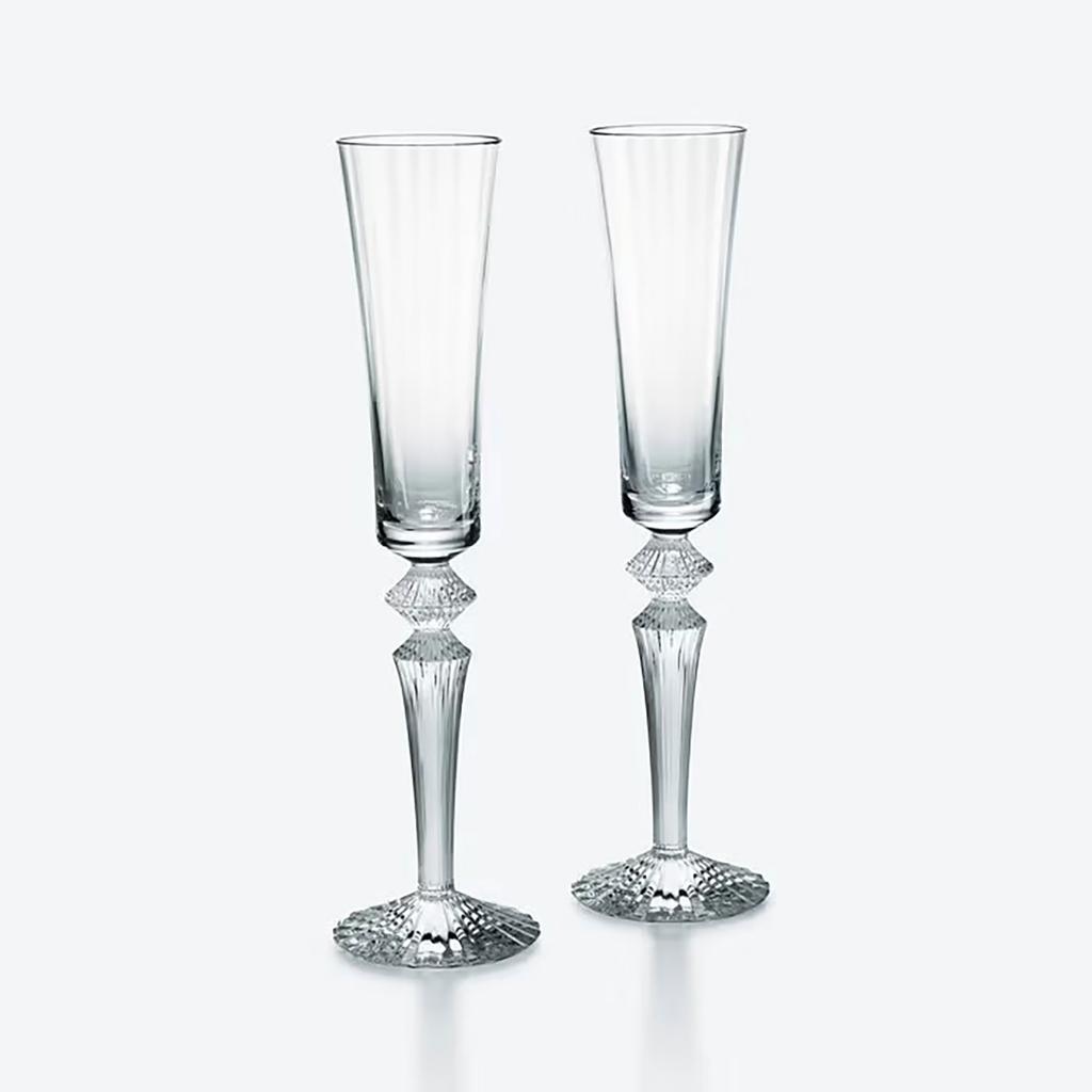 The name Mille Nuits is a reference to the 1001 Tales of The Arabian Nights and to the world of the Orient. The –issimo suffix emphasizes the design's overall sleekness. The smooth narrow bowl contrasts with the intricacy of the beveled stem: the detailing travels all the way down to the rid ged foot. The two halves are united by the elegant diamond-shaped center, which is the Mille Nuits si gnature. In addition to the Clear crystal, the Flutissimo is also available in a variety of vivid colors.