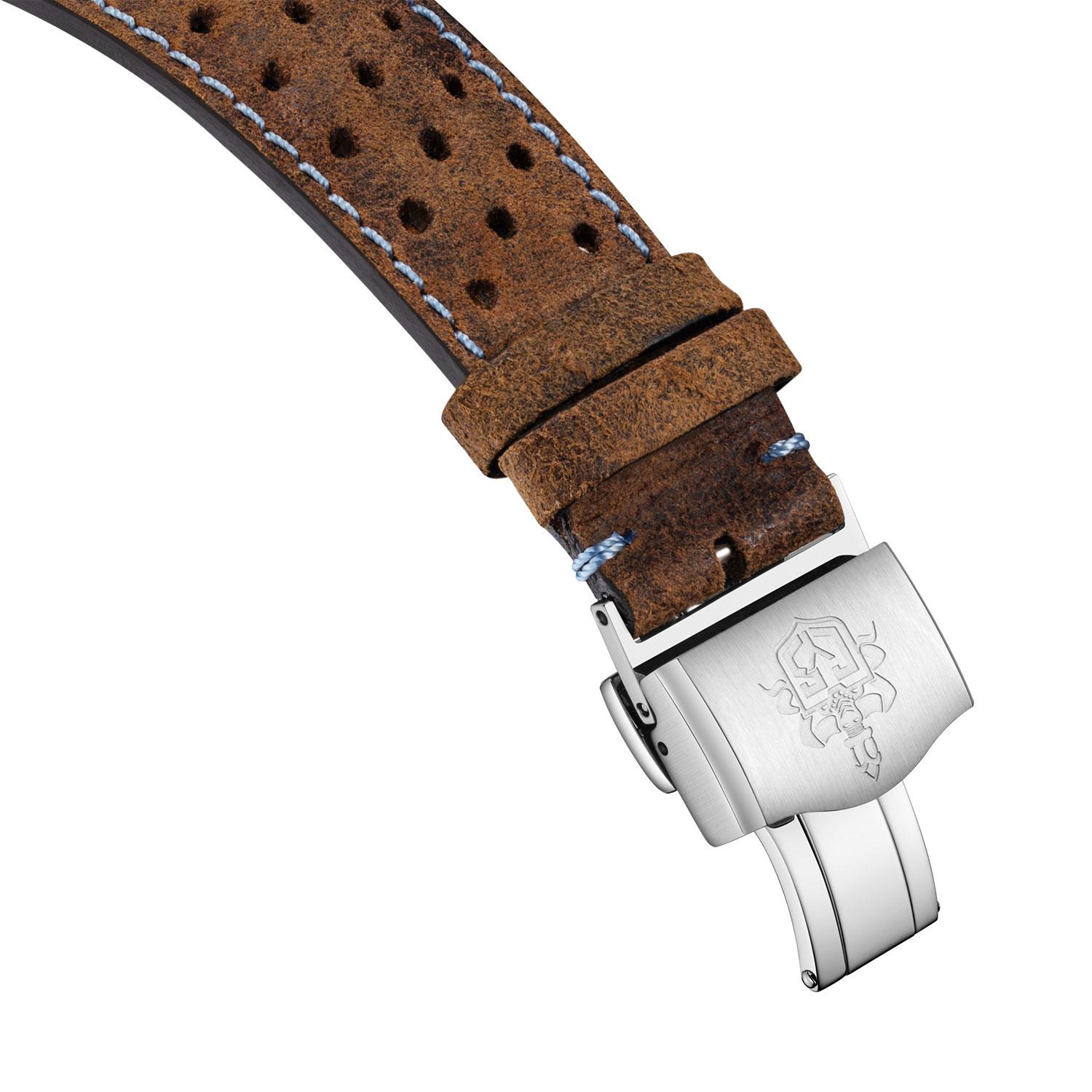 Strap:Brown perforated calf strap “driving style” with light blue stitching