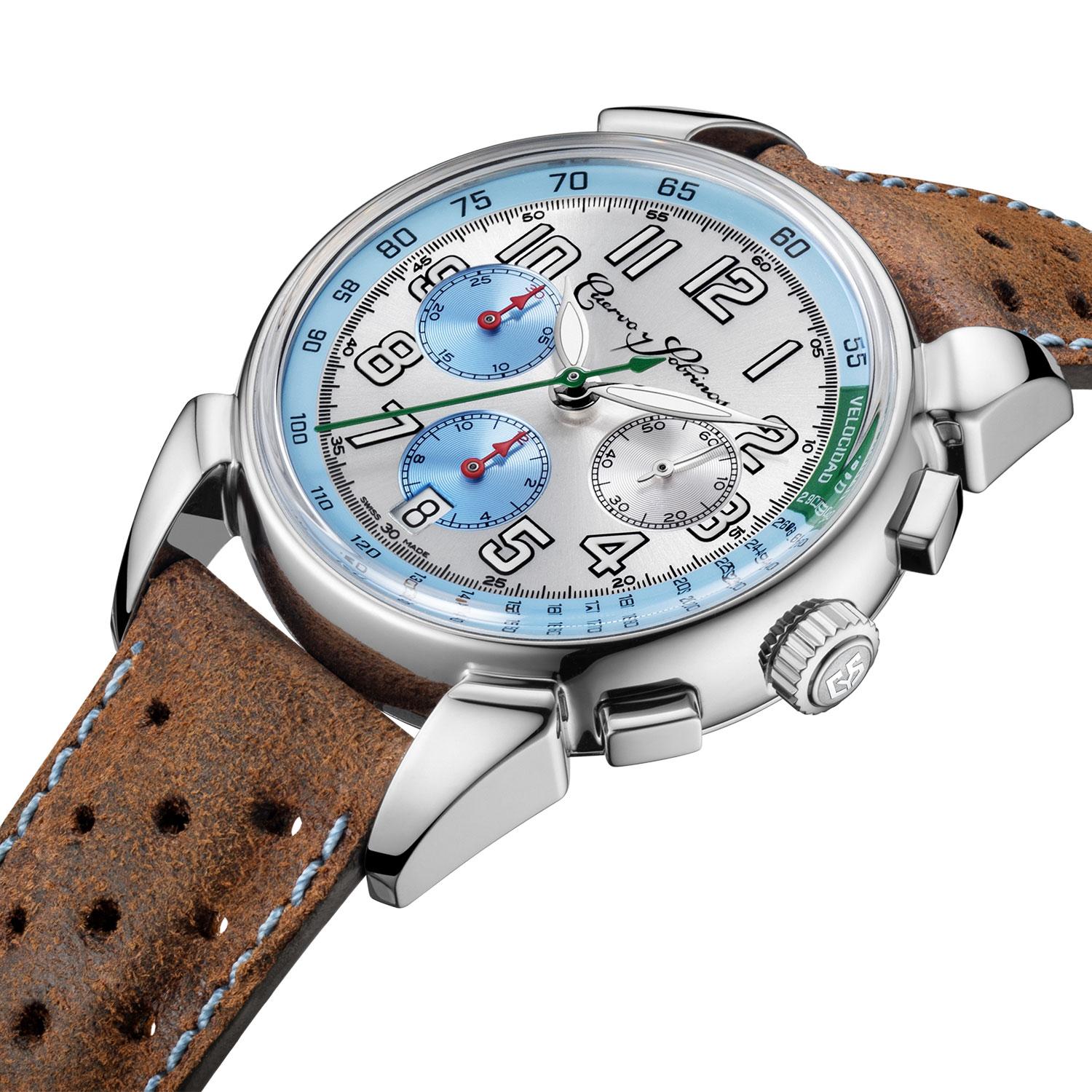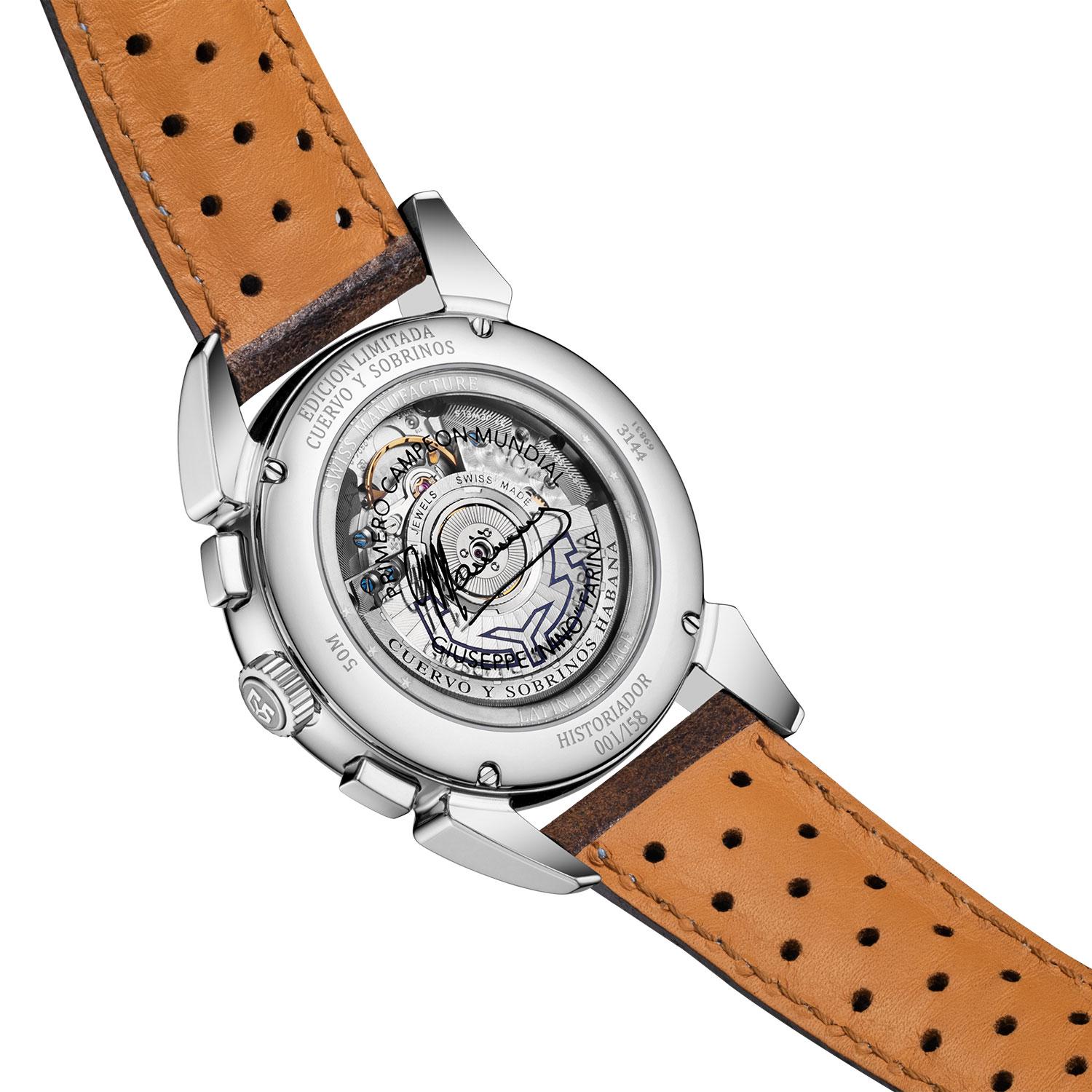 Cuervo y Sobrinos pays tribute to the first official Formula One World Champion "Nino" Farina who gained the title in 1950. The Historiador Nino Farina II follows the highly acclaimed first limited series that sold out in a very short time. It is a classy, vintage tri-compax chronograph, limited to 158 pieces, inspired by the historic race and featuring the colors of the iconic Alfa Romeo, but made for a modern audience."Nino Farina was the man of courage that bordered on the improbable. Capable of daring stunts that were often his winning move. A great driver, but one for whom you always had to be apprehensive.." - this the incipit with which Enzo Ferrari described Emilio Giuseppe Farina, also known as “Nino”.With a diameter of 40 mm, the Cuervo y Sobrinos Historiador Nino Farina II is housed in a stainless steel case. The dial sits under a double-curved sapphire crystal with anti-reflective treatment.The watch comes with a matte brown calf "racing style" strap with light blue stitching. It features numerous perforations, a detail inspired by racing gloves of bygone days. The case back is embellished with a dedication to the world champion ("Primero Campeon Mundial" - the first world champion) and his signature.
