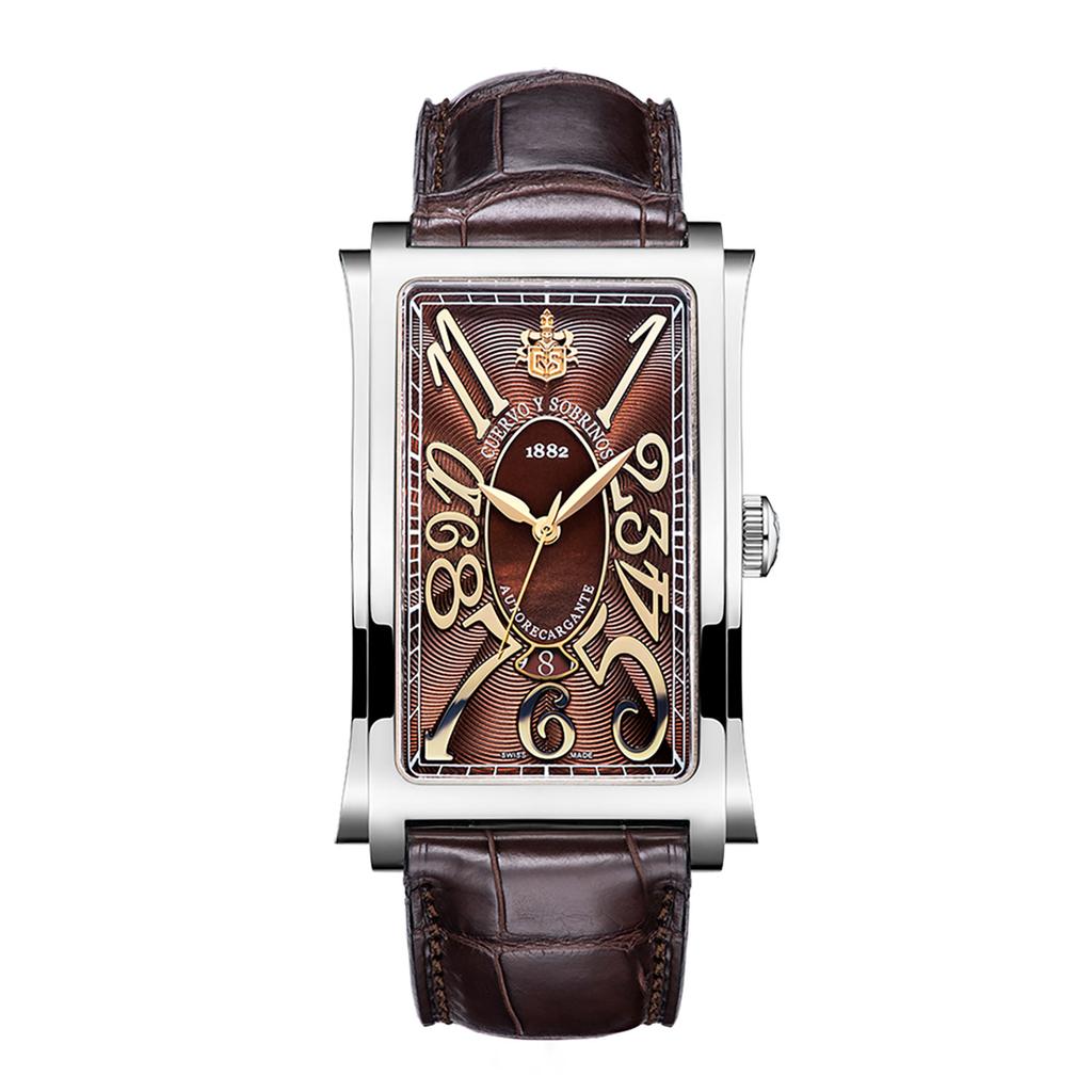 The Prominente Icónico is inspired by the bold Art Deco spirit of Havana in the 1940s, with its distinctive rectangular case — the largest in the Cuervo y Sobrinos collection — this watch embodies confidence and timeless style. Its elegant dial, framed by the elongated silhouette, is decorated with subtle guilloché and refined indexes that echo the golden age of Cuban glamour. Powered by a reliable automatic movement, the Prominente Icónico is a true statement piece for those who appreciate heritage with a modern twist.
