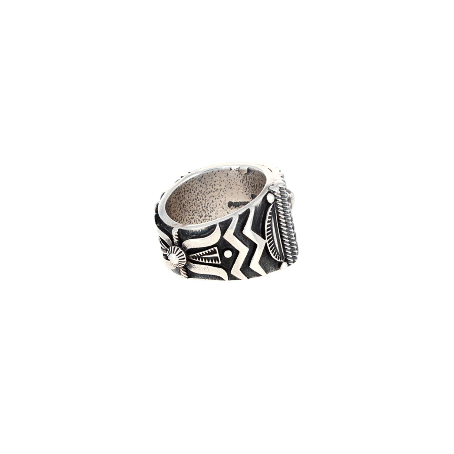 This ring feature sterling silver Thunderbird design with sun rays and stamped designs. This ring is a size 12.