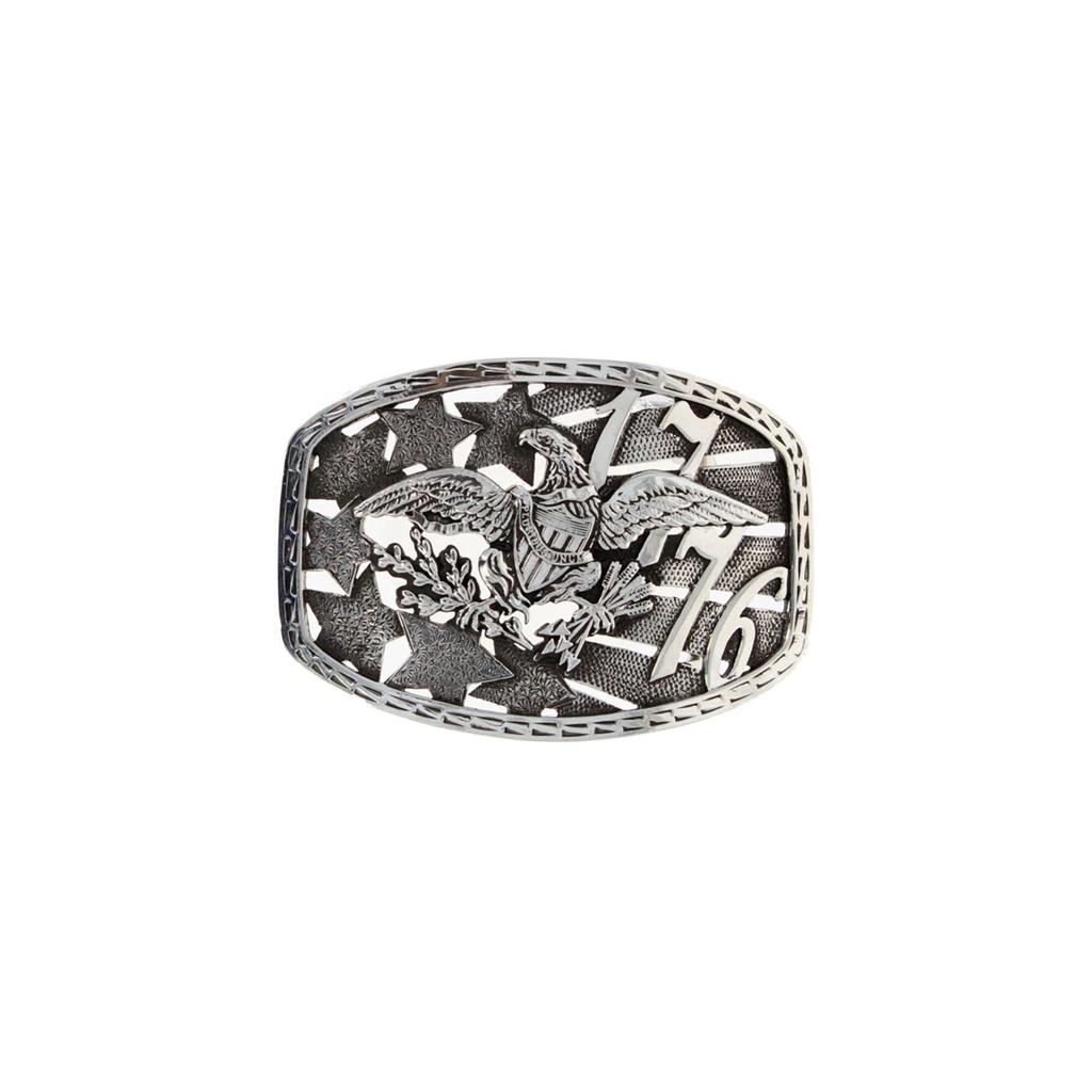 This buckle features the icon American Eagle carrying an olive branch and bundle of arrows with the date '1776' in the background on a sterling silver belt buckle. This buckle is 3 1/2 x 1/2 inches and is for a 2 1/4 inch belt.