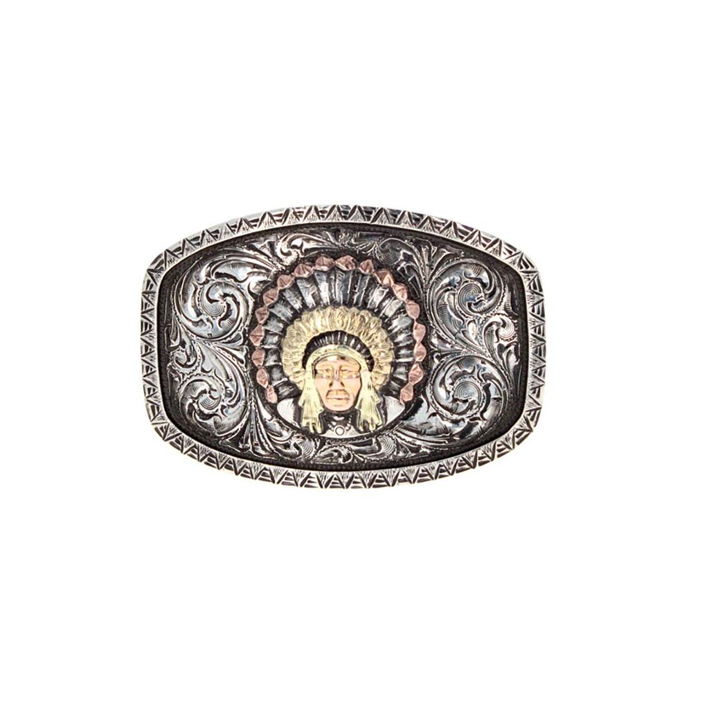 This buckle features one of the most popular Bohlin designs in 14kt yellow and rose gold of Red Chief Wolf, a famous actor in the Buffalo Bill Cody Show who was Ed Bohlin lifelong friend in the center on sterling silver rodeo style engraving and hand etched edging. This buckle is 3 1/2 x 1/2 inches and is for a 2 1/4 inch belt.