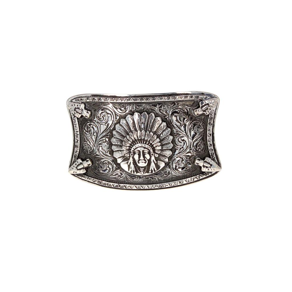 This buckle features one of the most popular Bohlin designs in sterling silver of Red Chief Wolf, a famous actor in the Buffalo Bill Cody Show who was Ed Bohlin lifelong friend in the center and silver4 arrows on each corner with rodeo style engraving and hand etched edging. This buckle is 3 1/2 x 1/2 inches and is for a 2 1/4 inch belt.