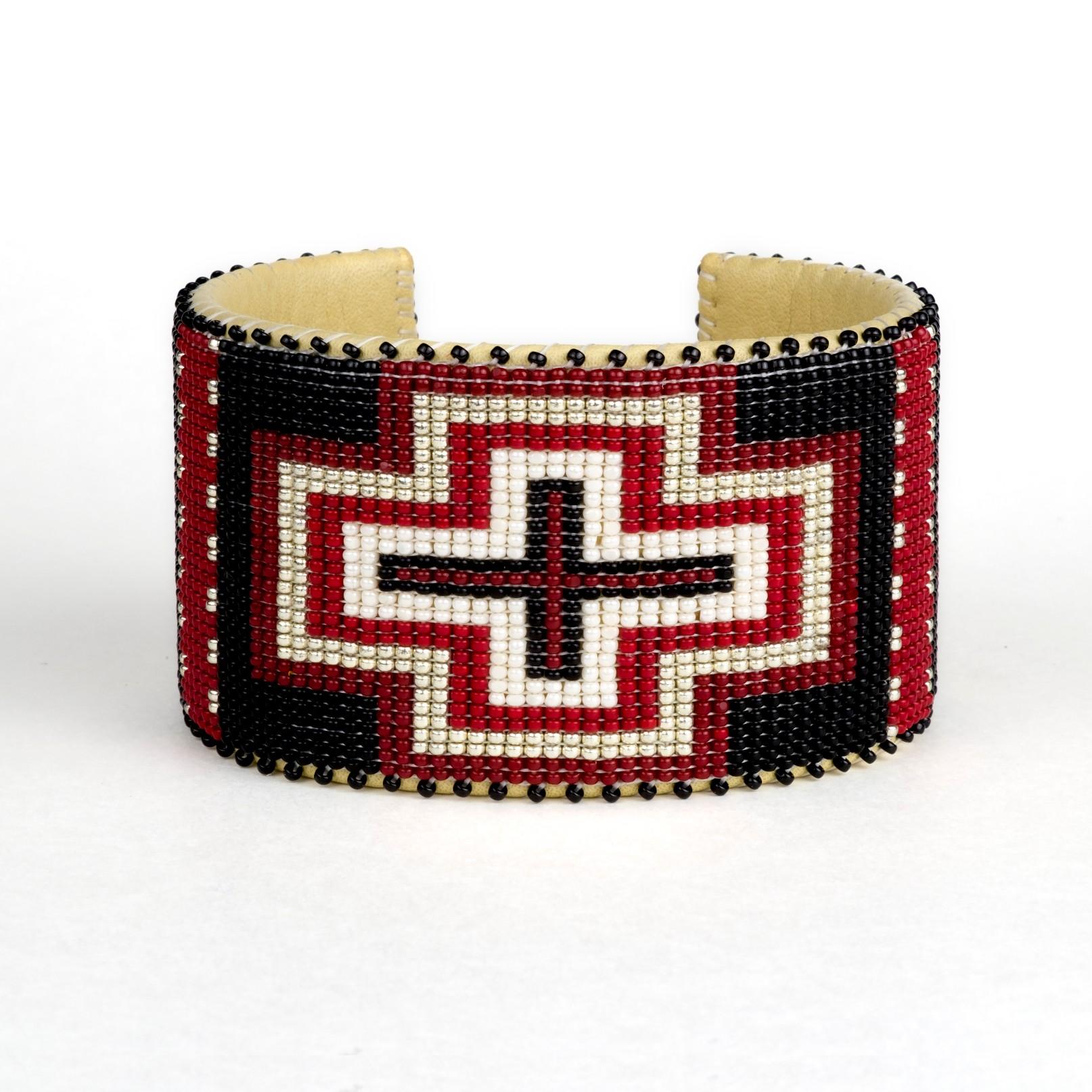 This cuff is hand-beaded on a traditional Navajo loom and made with high quality seed beads. After the pattern is arranged on the loom, the beads are sewn onto our super soft genuine leather lining. With this bracelet, minor changes in color patterns may occur. This cuff measures 6 inches x 1 1/2 inch and has an adjustable copper band inside.