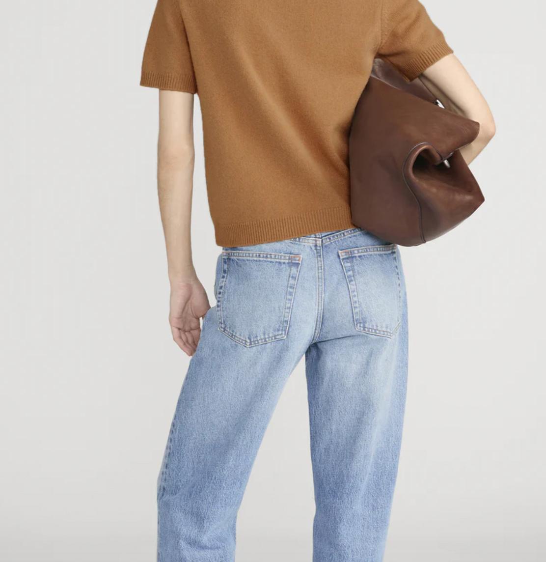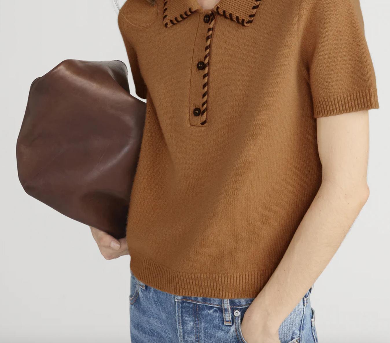 The Leather Stitch Polo is crafted from a soft wool–cashmere blend, featuring genuine leather whipstitch detailing at the neckline and a clean button closure for a refined take on a classic knit.