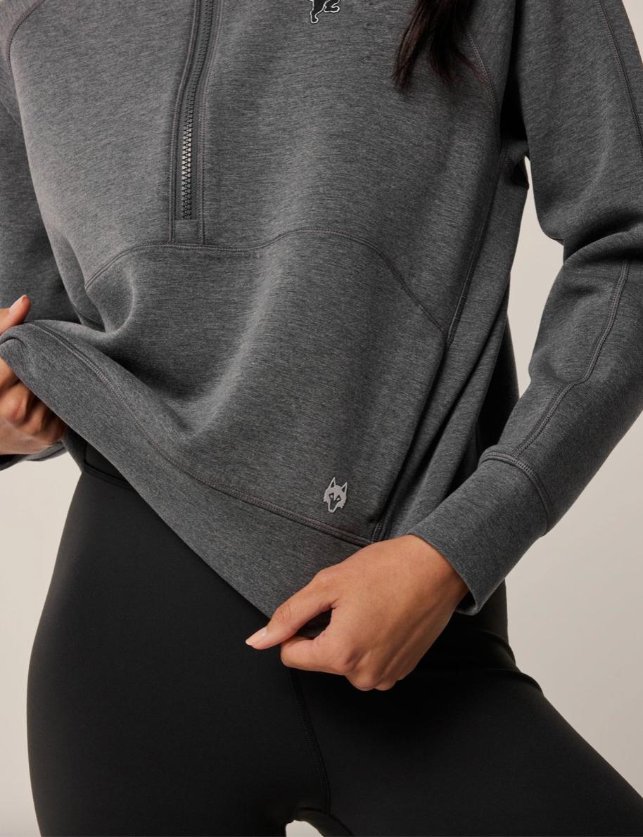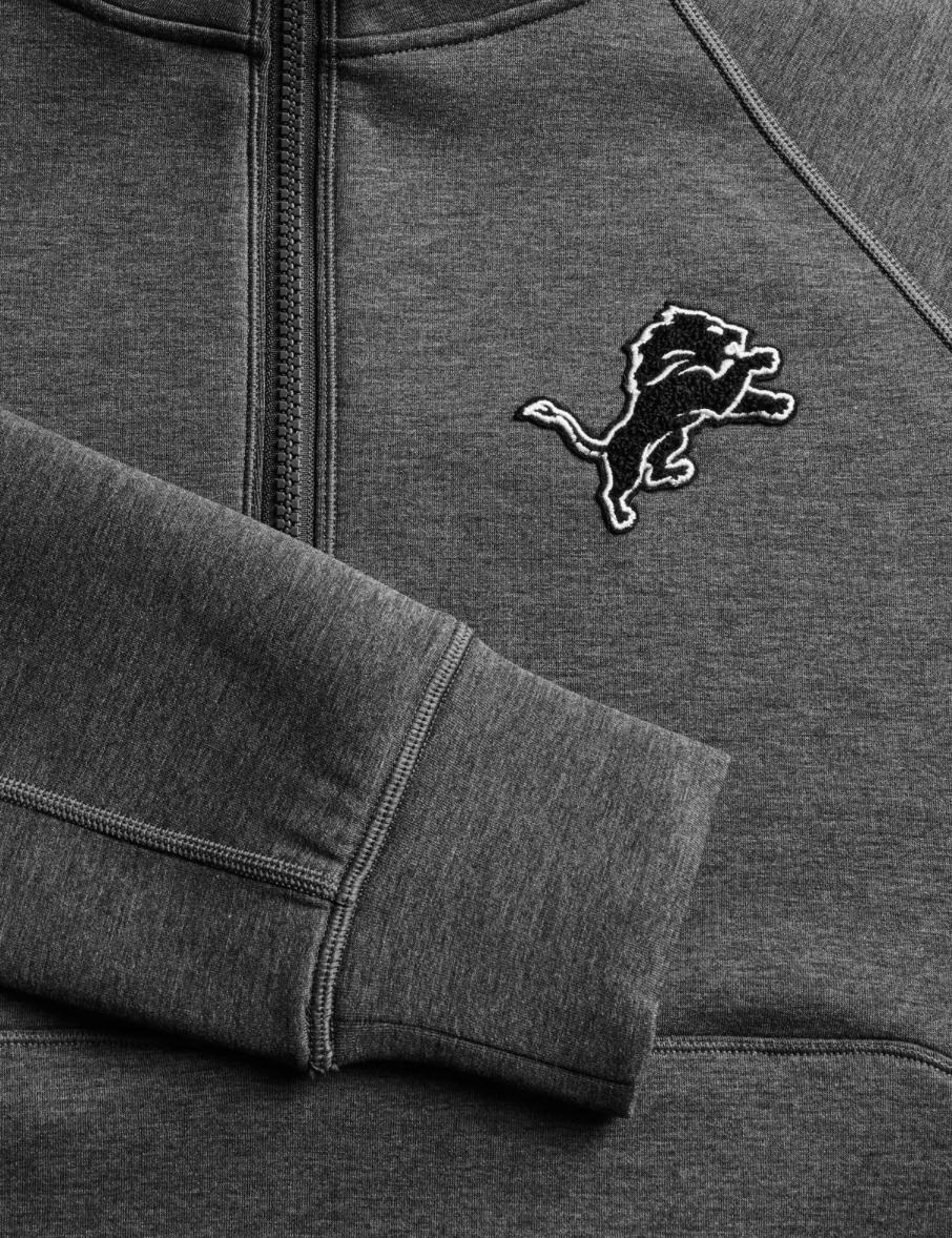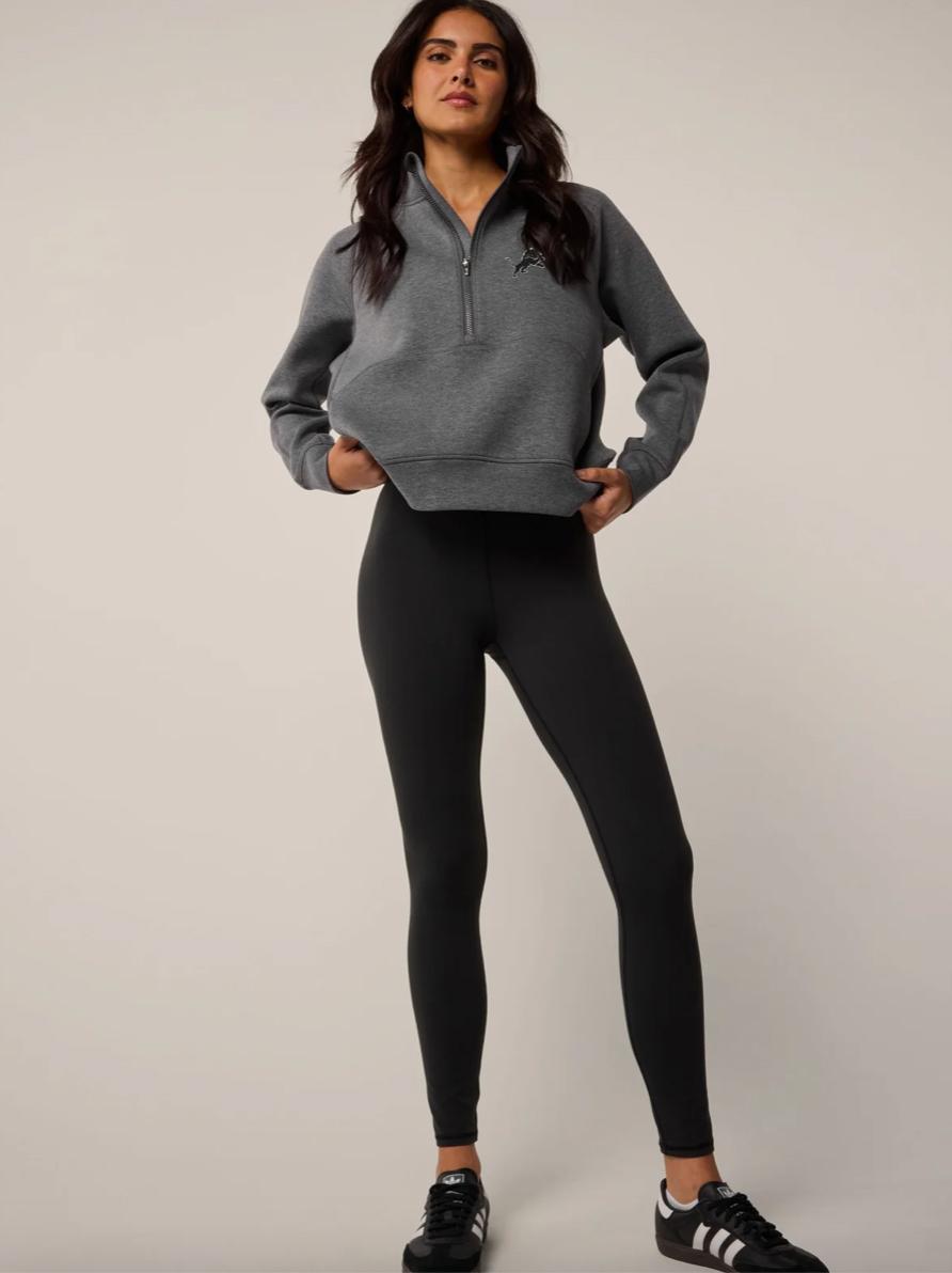 The Lions Cross Bones Kristina Mélange Half Zip is crafted from an innovative melange fabric, a blend of elastane that offers plenty of stretch for your active lifestyle. The melange effect adds a subtle texture and depth to the fabric, enhancing its modern appeal. Cropped at the waist for a contemporary fit and designed with a fashion-forward silhouette, it features a stand-up collar that retains its shape for added comfort. Finished with ribbed hems and cuffs, this hoodie combines style and functionality seamlessly. This custom product is part of a limited Greyson x Detroit Lions capsule from our Greyson for the NFL collection.