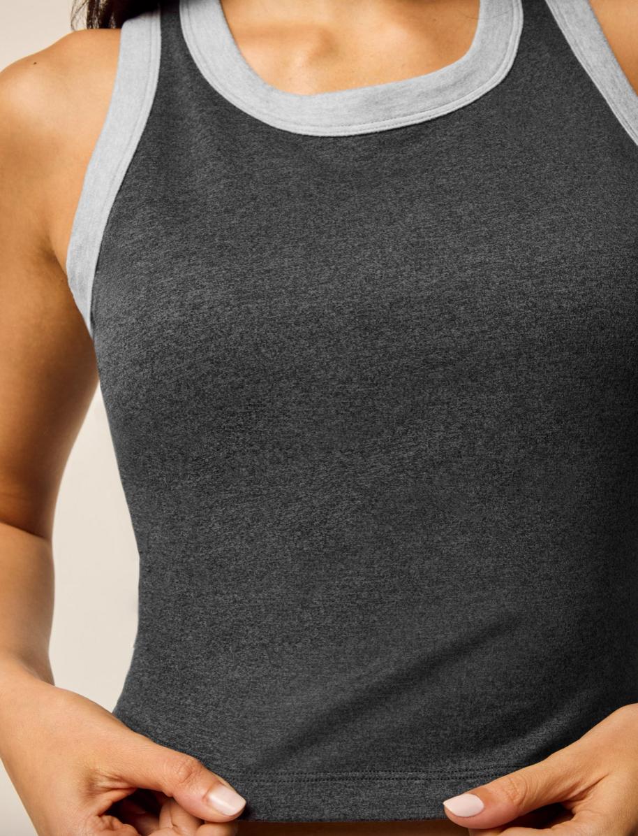 The Rhinebeck Two Tone Tank delivers a sleek, supportive fit with a lightweight fabric for all-day performance. Featuring a high neckline and a built-in shelf bra with removable pads, this women's tank top offers a modern, versatile silhouette. The luxurious brushed fabric provides natural stretch, exceptional softness, and pilling resistance, ensuring an effortless transition from workouts to everyday wear. A refined essential with a modern two-tone design for your everyday wardrobe.
