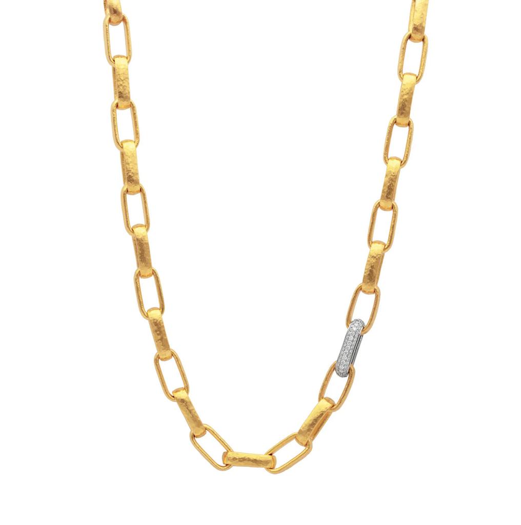 This necklace features hand hammered 24k Gold thick links with one pave diamond link and a lobster clasp. The diamonds are 1.92 and is 18 inches.