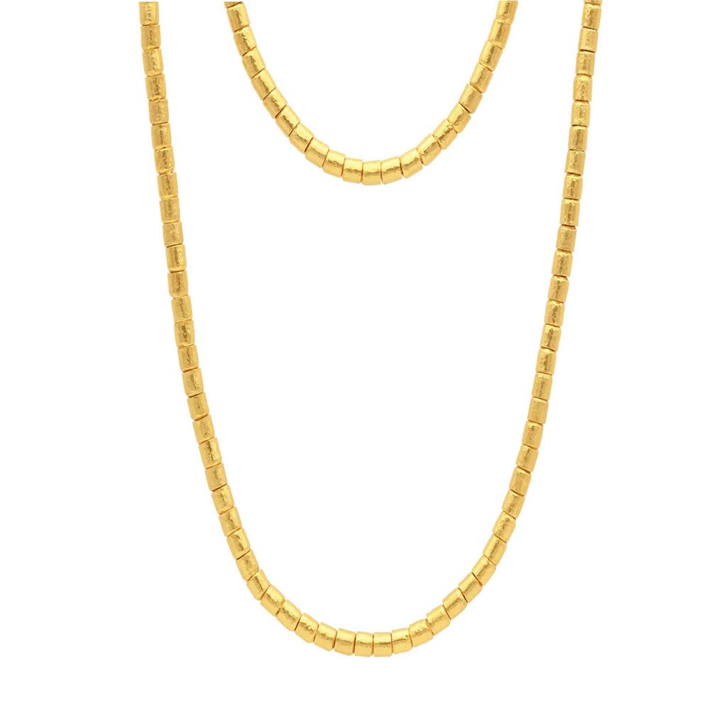 This necklace features 24kt yellow gold tube beads with a gold clasp. The beads are 5.5mm and measures 36".