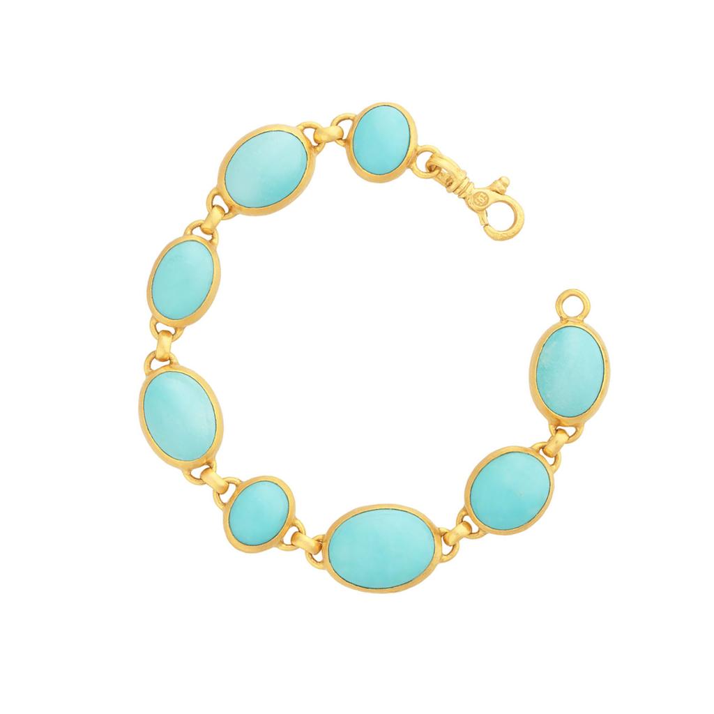 This bracelets features 24kt yellow gold bezel set sleeping beauty turquoise cabochons with gold links and a lobster clasp. The turquoise is 52.6ct and is 7 1/4 inches.
