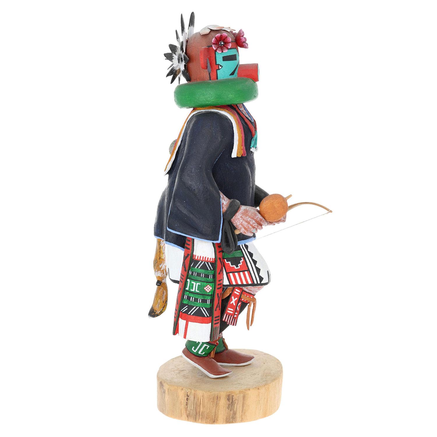 Naavan’ kachina is an old Hopi style kachina carving which wears a ribbon shirt. He represent the blooming of plant life and focuses on the beauty of life, as indicated by the flowers worn on his face. His songs are prayers for rain to sustain all life forms. This carving is 12 inches.