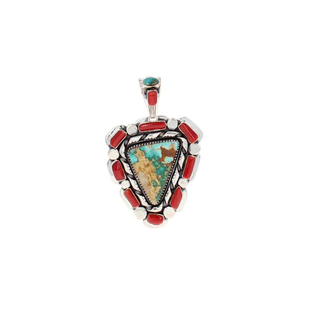 This pendant features sterling silver bezel set Coral surrounding a bezel set Royston Turquoise triangle cabochon with a polished rope in the center with polish silver dots and a silver bail with coral. The pendant measures 3 1/2 inches with a 1 inch bail.