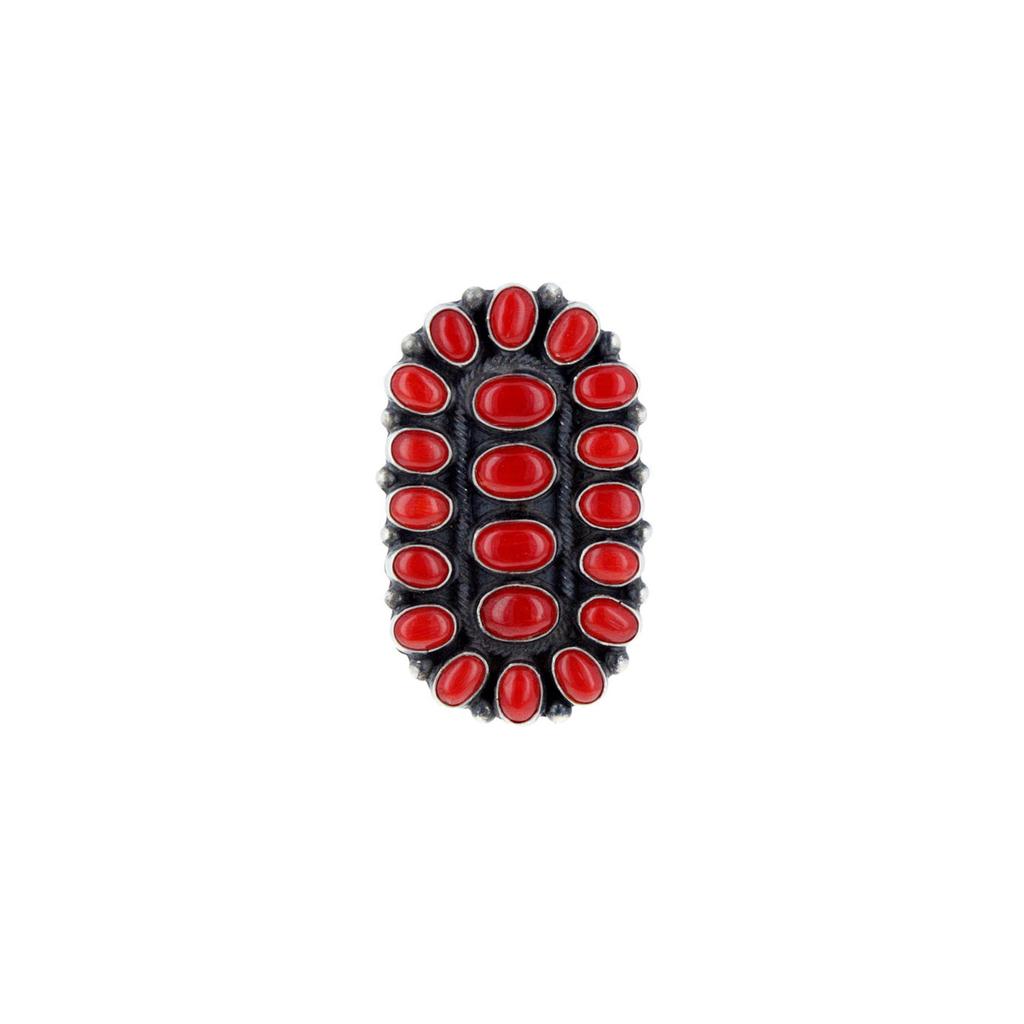 This ring features a sterling silver bezel set Coral cabochons with oxidized silver dot beads on a silver band. This ring is adjustable.