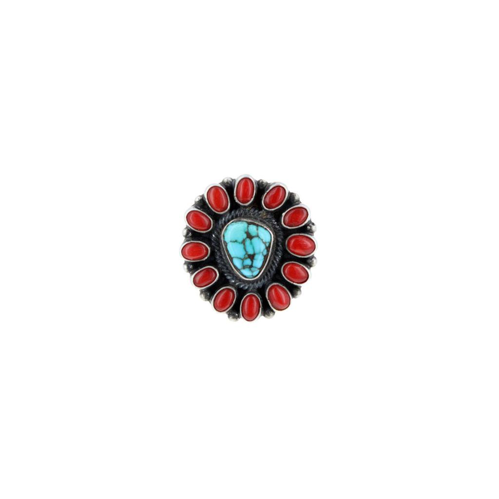 This ring features a sterling silver bezel set Egyptian Turquoise and Coral cabochons with silver dot beads on a silver stacked band. This ring is adjustable.