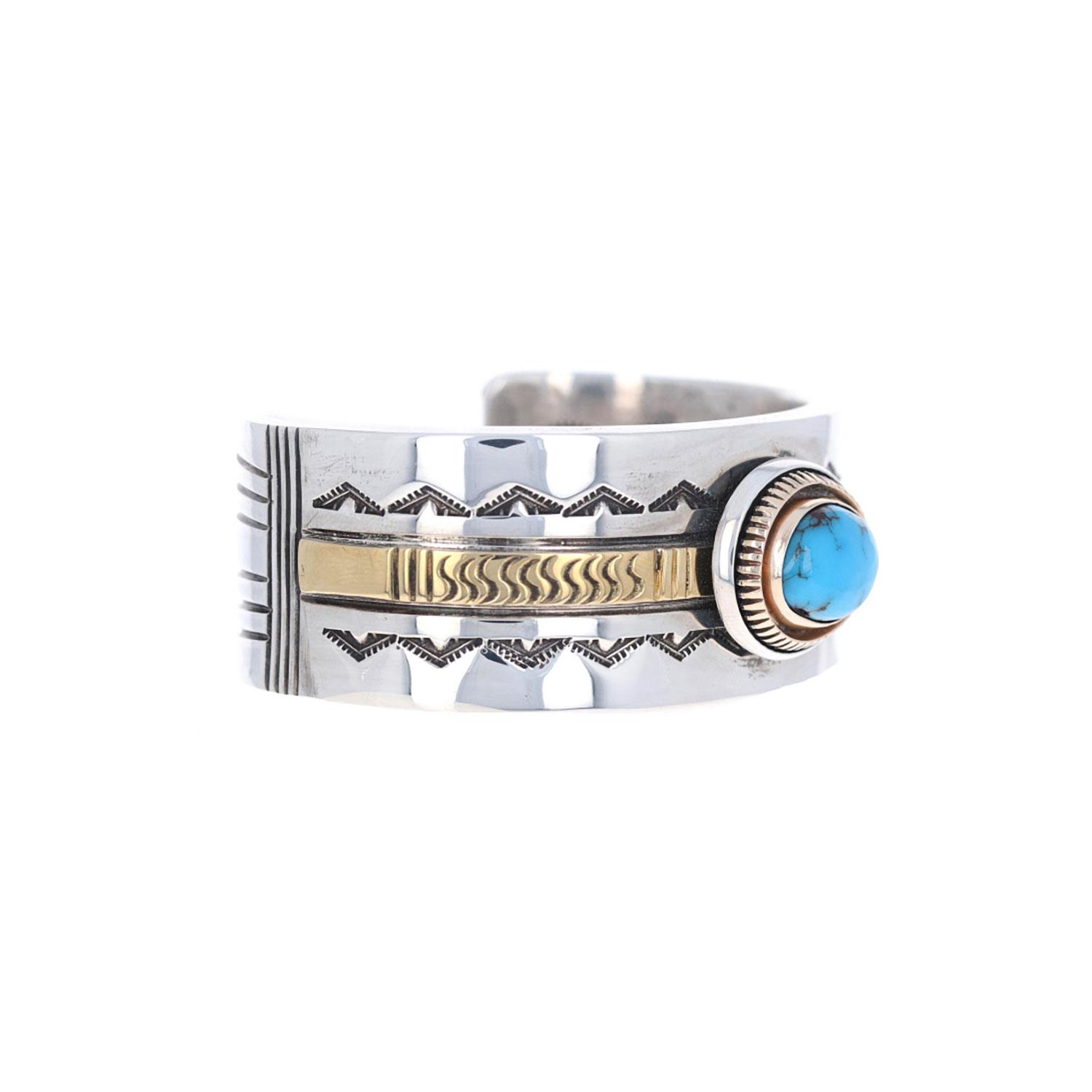 14kt Yellow Gold, Sterling Silver, and Bisbee Turquoise Cuff by artist Leonard Nez.
