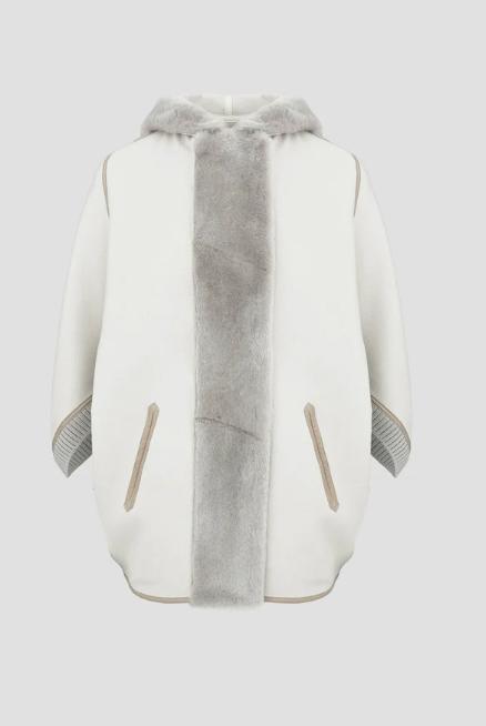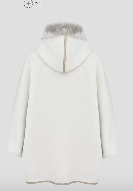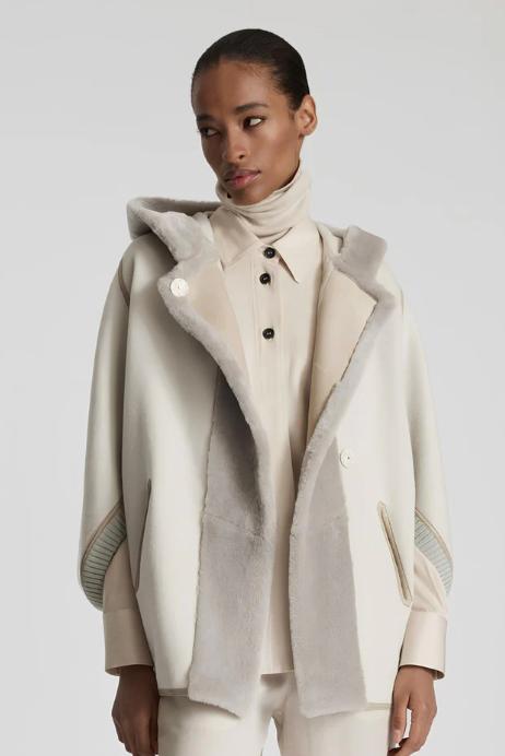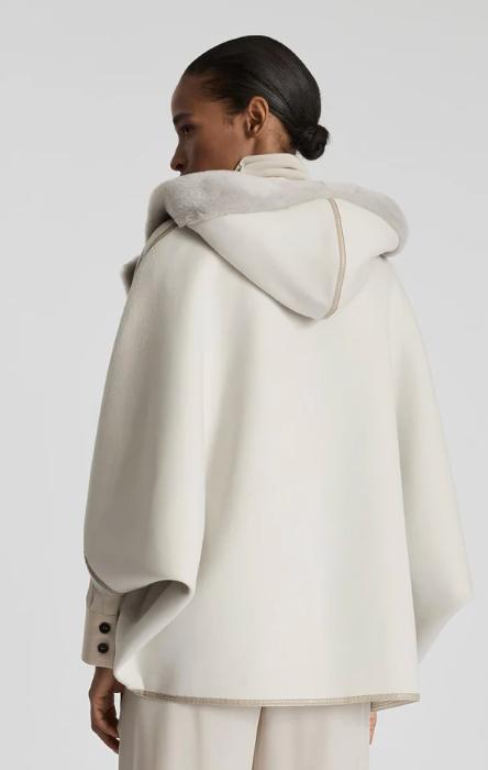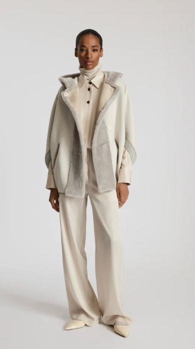 A sophisticated coat with a retro flair, this outerwear piece is crafted from the iconic double wool fabric in virgin wool and angora, a luxurious material with an exceptionally velvety finish that stands out for its comfortable, cozy structure while remaining lightweight to wear. Thesheepskintrims along the hood and closure add a warm, soft touch, and with the maisons most representative shade, travertine, makes this garment perfect for the colder seasons.