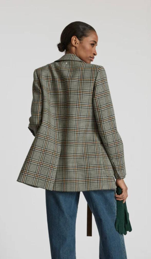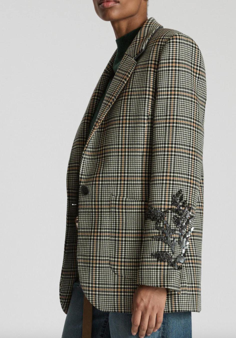 This tailored jacket revisits the classic Lorena Antoniazzi design, drawing inspiration from menswear tailoring through its peaked lapels and elongated cut. It is crafted from a premium virgin wool yarn that offers exceptional comfort and softness when worn. The fabric features a timeless, irresistible, and refined check pattern, further embellished by an intricate nature-inspired paillette embroidery. Though envisioned to be worn as part of a coordinated suit with matching trousers, it also appears exceptionally chic and refined when paired in more relaxed broken suits.