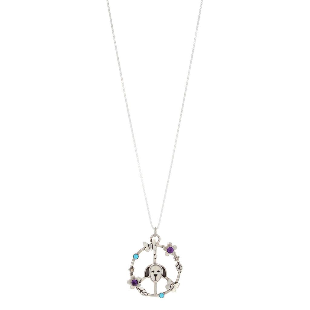 This necklace features a sterling silver bezel set fossil cabochon of a sleepy Dog ,bezel set Sleeping Beauty turquoise cabochon, butterfly silver accents, 14kt yellow gold dot beads, and pink mussel flowering on sterling silver peace signs. The pendant is 1 inch and is 18inches.