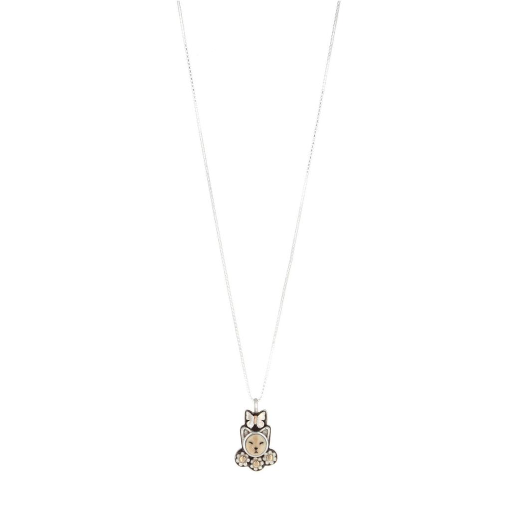 This pendant features a sterling silver bezel set cream fossil cabochon of a kitten, three silver flowers with 14kt yellow gold dot beads, and butterfly charm on a silver chain. This pendant measures 1/2 inches and is 18 inches.