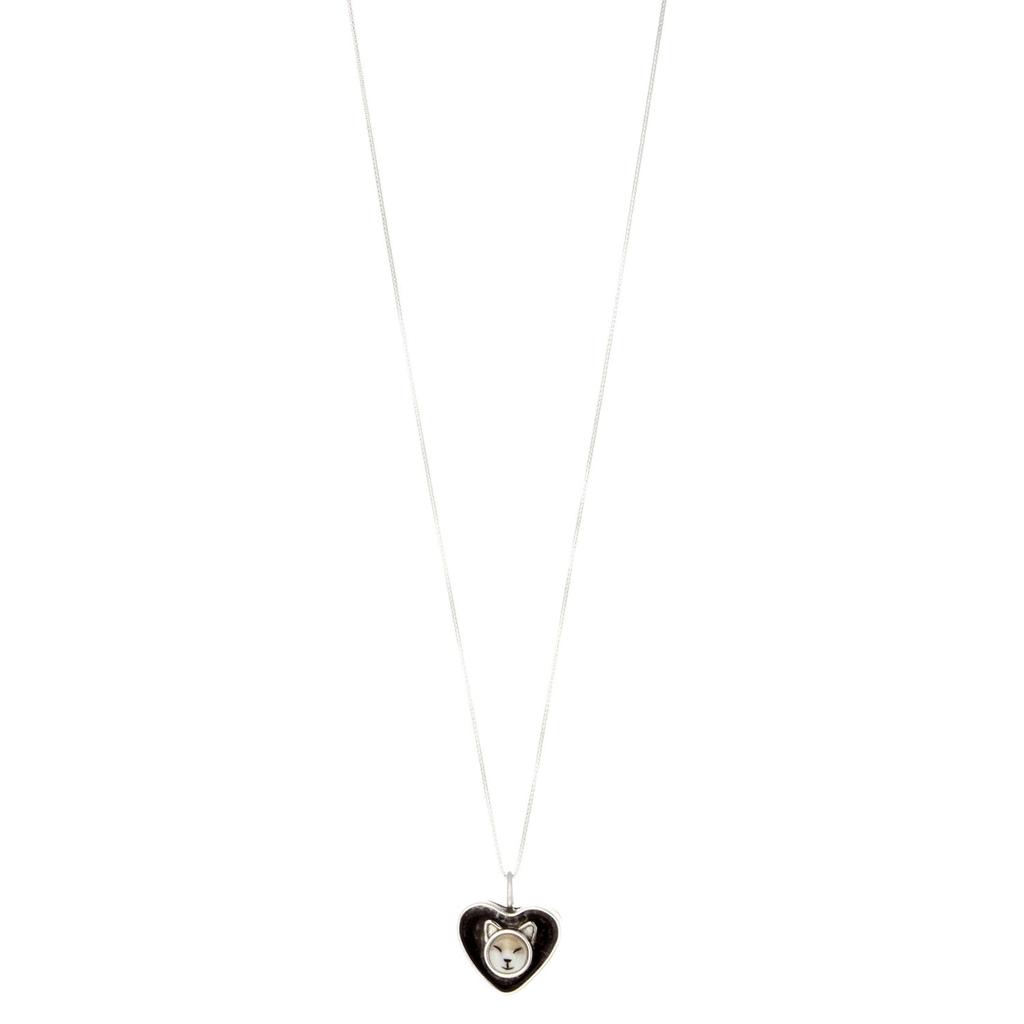 This necklace features a sterling silver bezel set fossil of a kitten in the center of a silver heart shadowbox on a sterling silver box chain. The pendant measures 3/4 inch and is 18 inches.