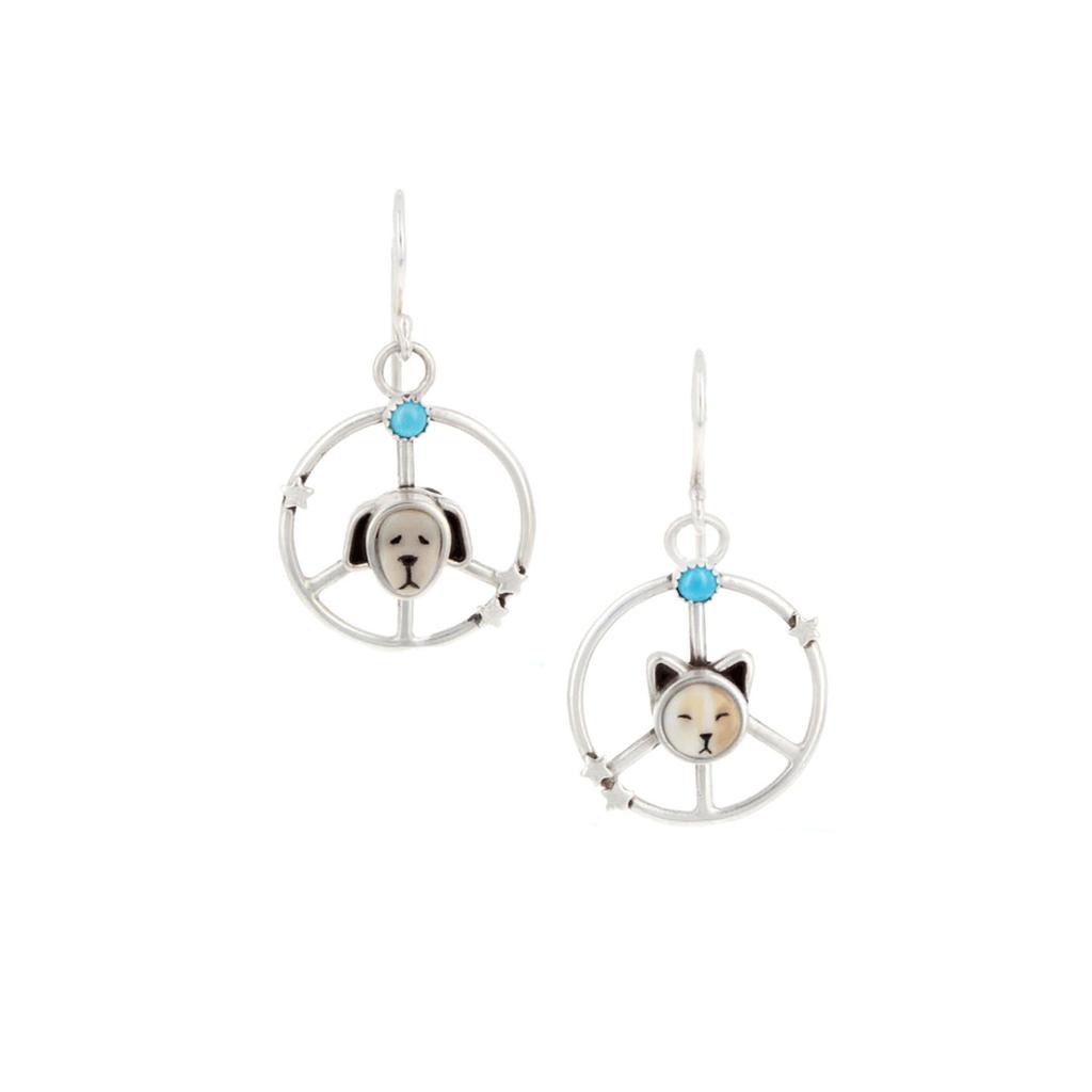 These earrings features a sterling silver bezel set fossil cabochon of a sleepy kitten and puppy with star accents and bezel set Sleeping Beauty turquoise cabochons on sterling silver peace signs on sterling french hooks. The earrings measures 1 inch and is 1 1/2 inches.