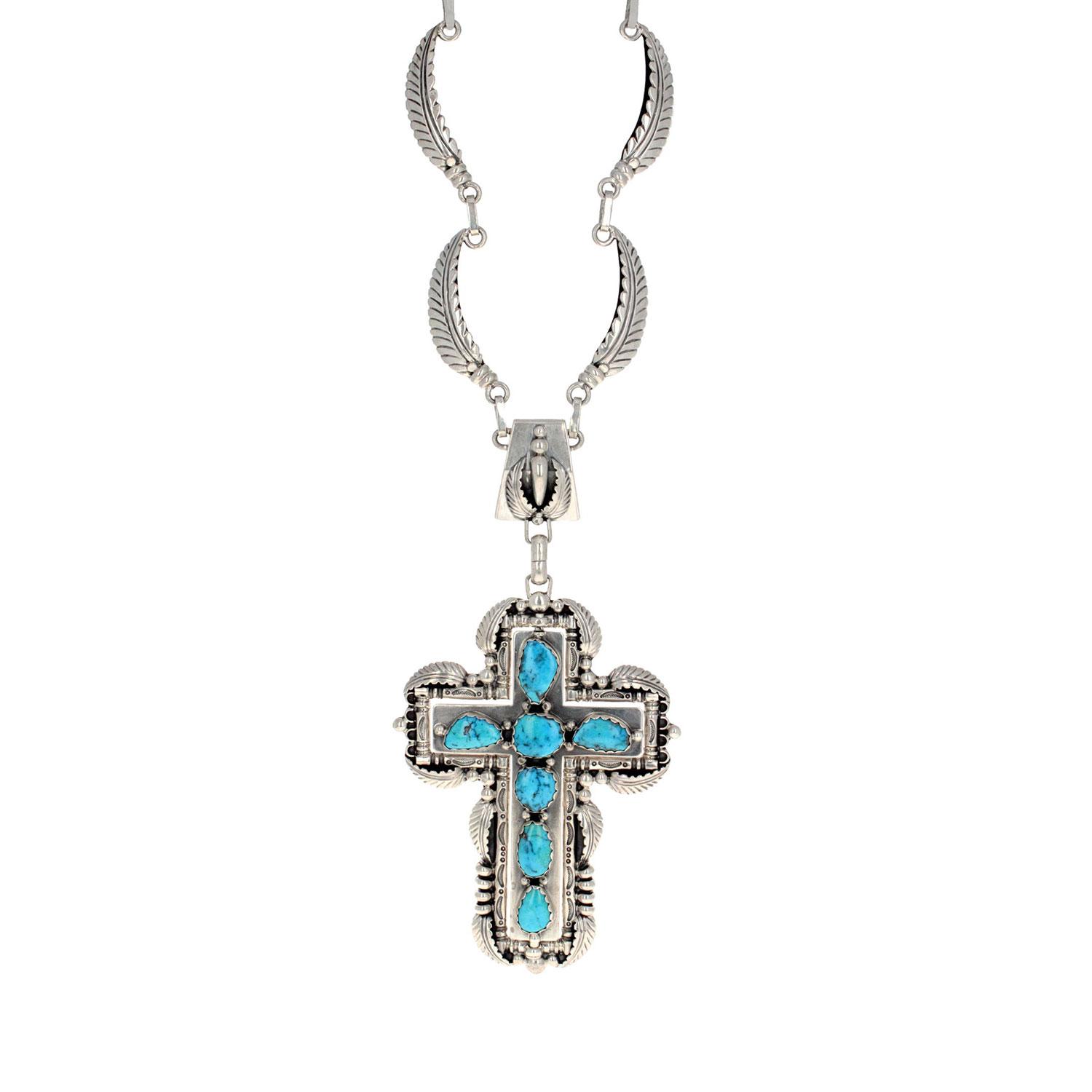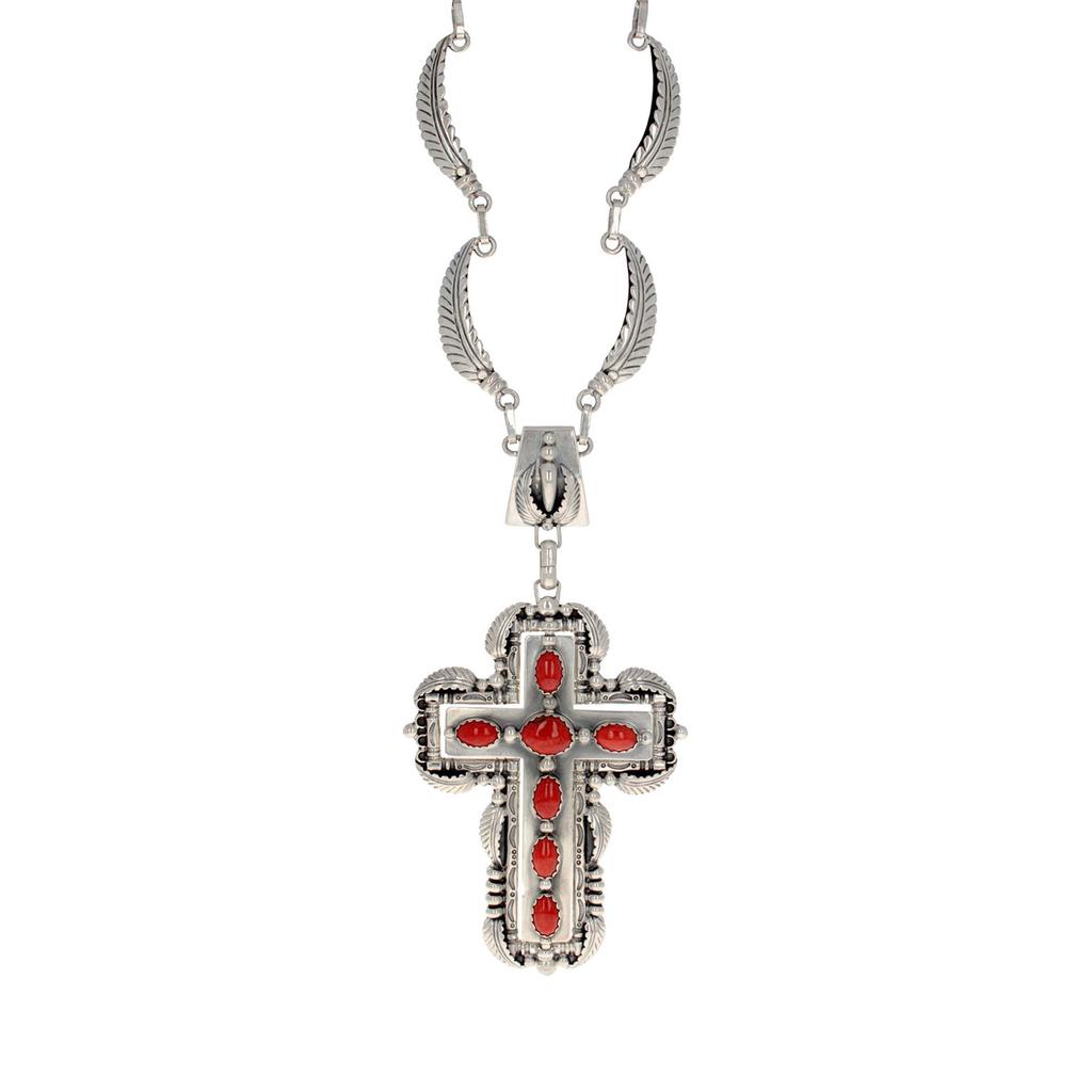 This necklace features a swiveling cross in the center with bezel set Turquoise cabochons on one side while the reverse side has bezel set coral cabochons along the cross with silver design on a silver leaf segment necklace. The cross measures 4 inches and is 22 inches.