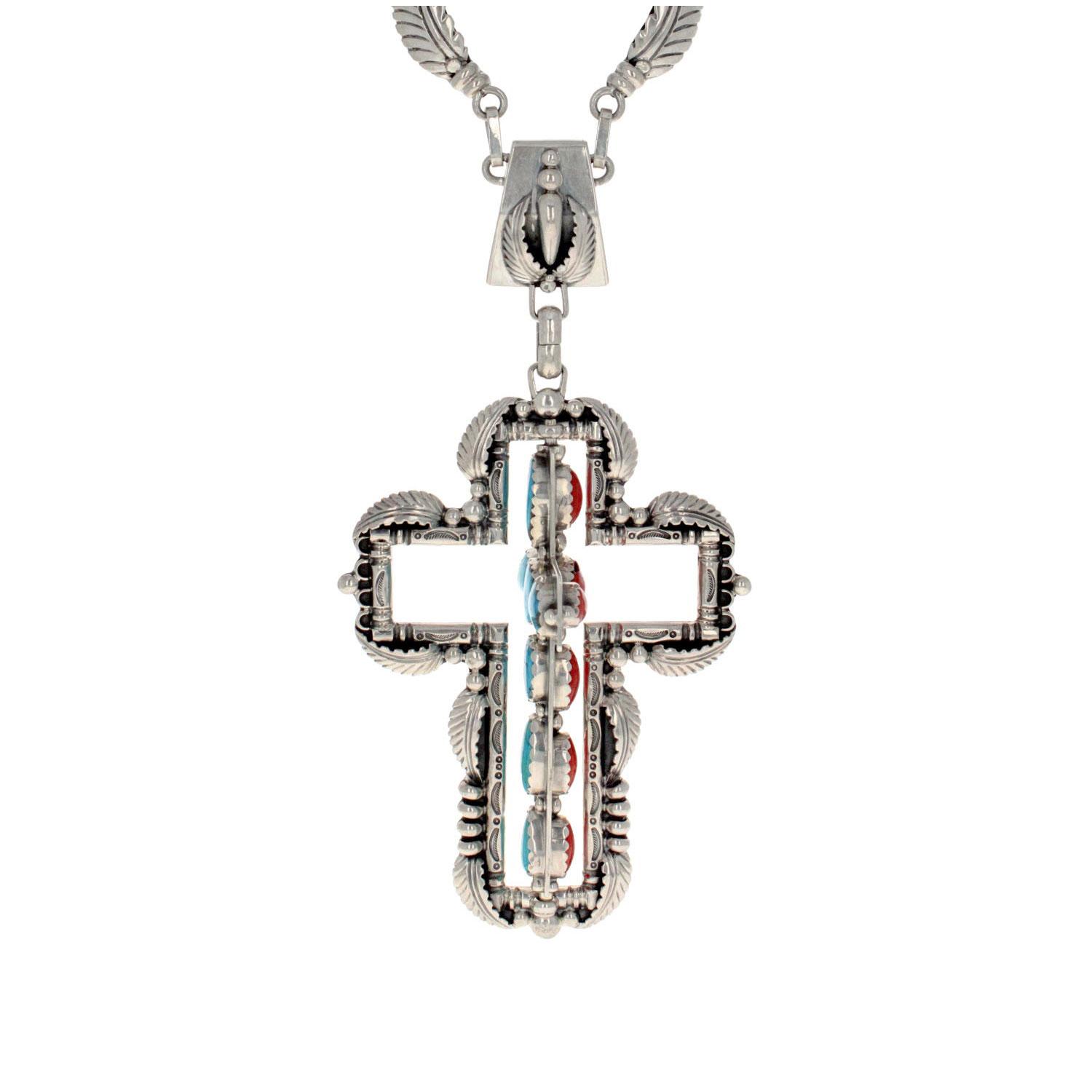 Sterling Silver, Coral, and Turquoise Reversible Cross Pendant Necklace.