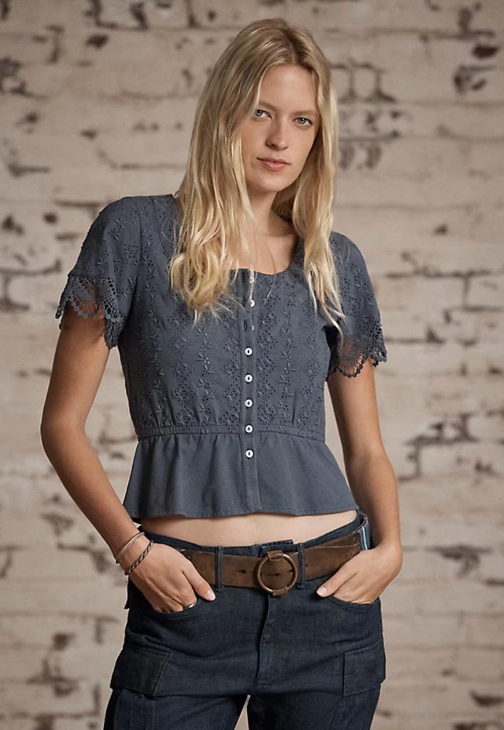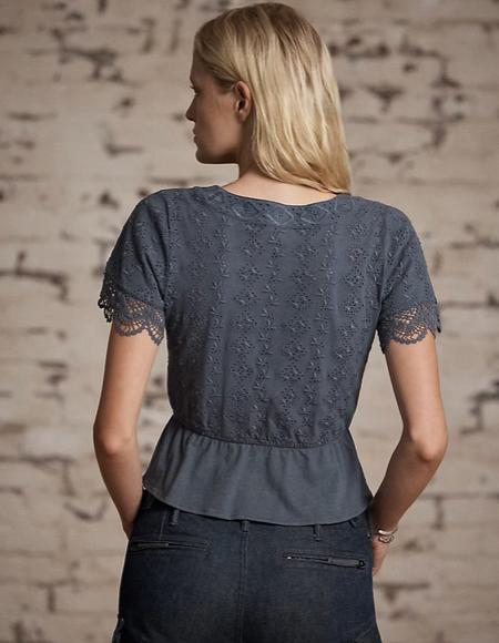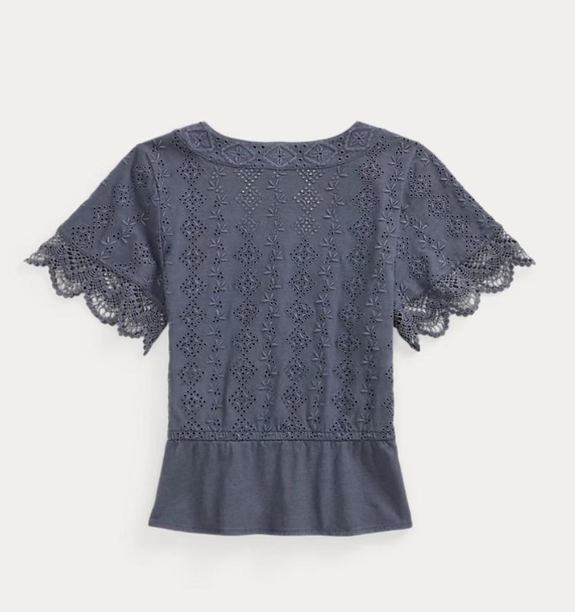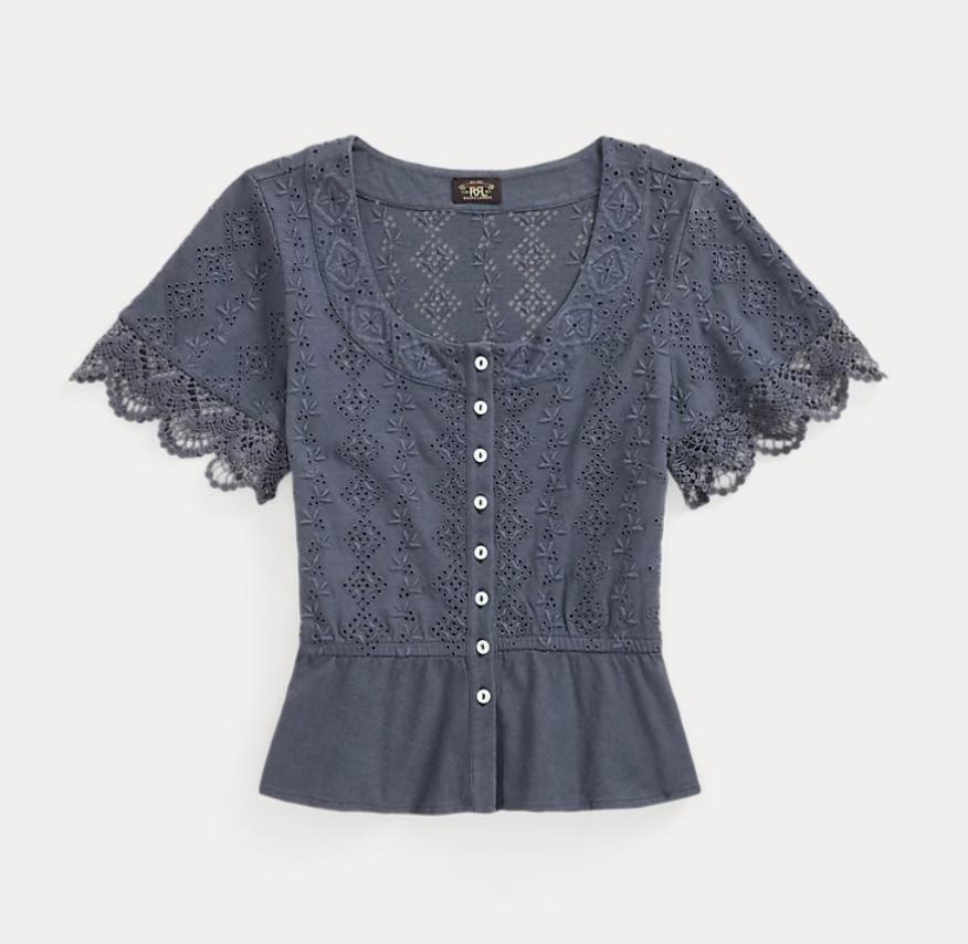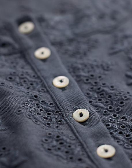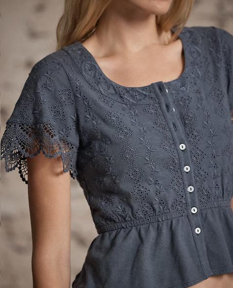 Made with cotton-and-linen jersey that is embroidered throughout. Modeled after an early 20th–century chemise. Scalloped lace trim at the cuffs. Peplum waist. Genuine mother-of-pearl buttons.