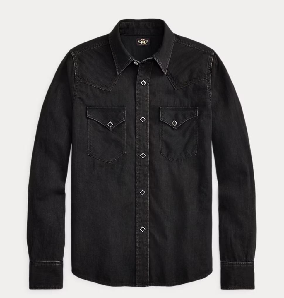 Western-style shirt made with lightweight denim from Japan. Vintage black wash. Tonal black and brown embroidery at the yokes, placket, and cuffs. Diamond-shaped snaps. Metal button at the collar.