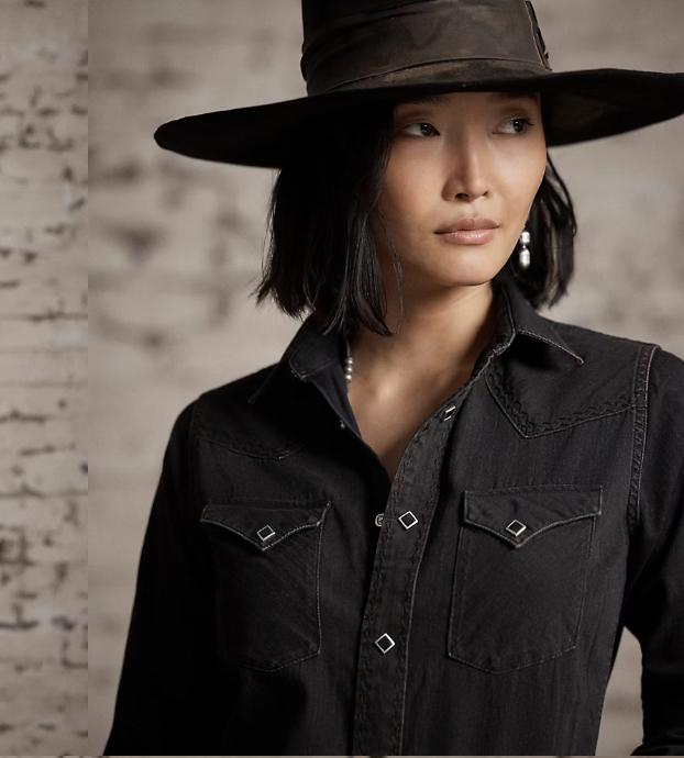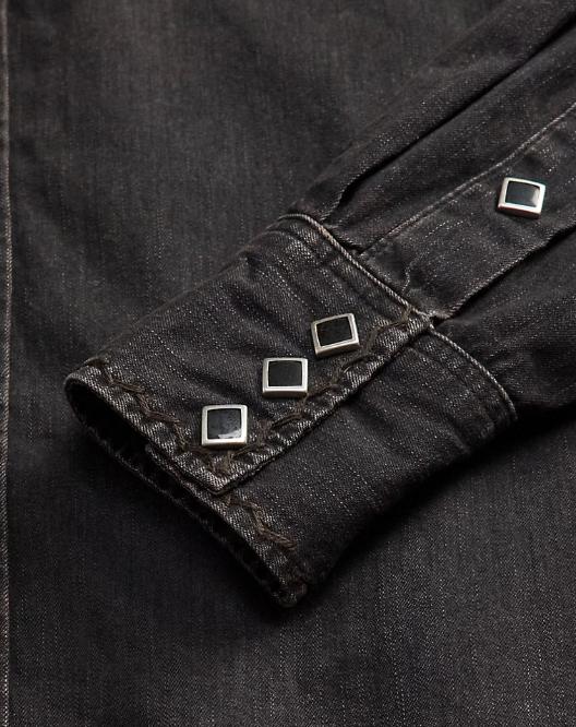 Western-style shirt made with lightweight denim from Japan. Vintage black wash. Tonal black and brown embroidery at the yokes, placket, and cuffs. Diamond-shaped snaps. Metal button at the collar.