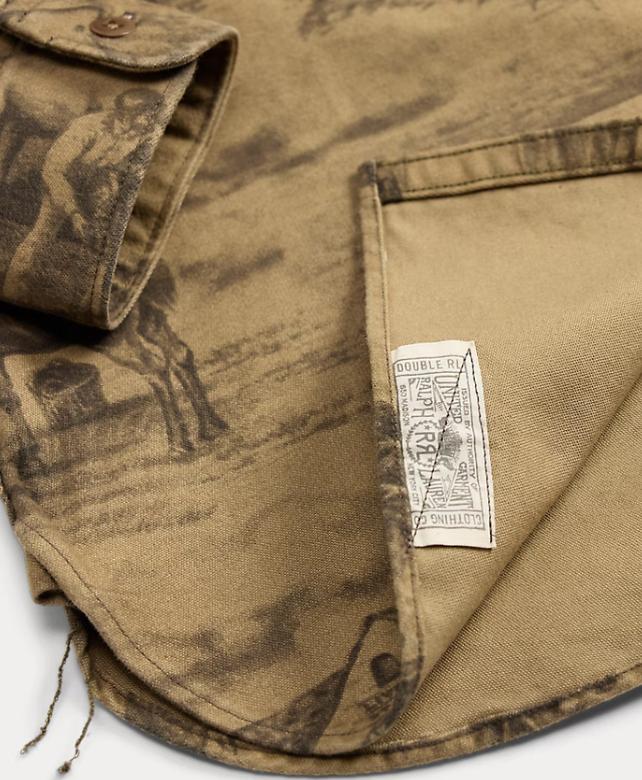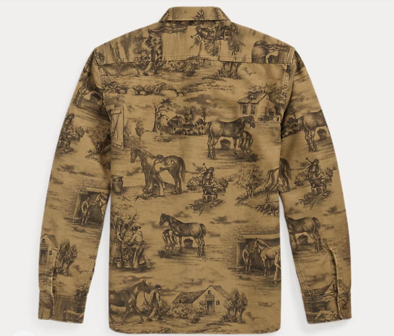 Made with brushed cotton moleskin. Printed with an antique equestrian–inspired toile motif. Authentic runoff chain-stitched construction at the side seams, which is based on workshirts from the 1920s and ’30s. Vintage-style corozo buttons. Washed to achieve tonal dimension and an authentic timeworn effect.