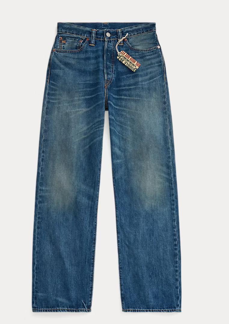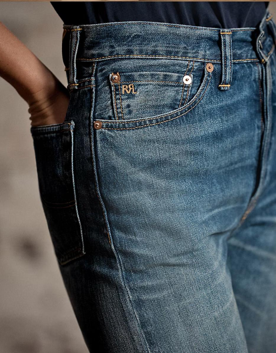 - American-made button, rivets, and washer burrs. Five-pocket styling. “RRL” embroidery at the coin pocket. "RRL"-debossed logo patch at the back right waist. Dyed with indigo, which may rub off onto fabrics, leather, and upholstery.