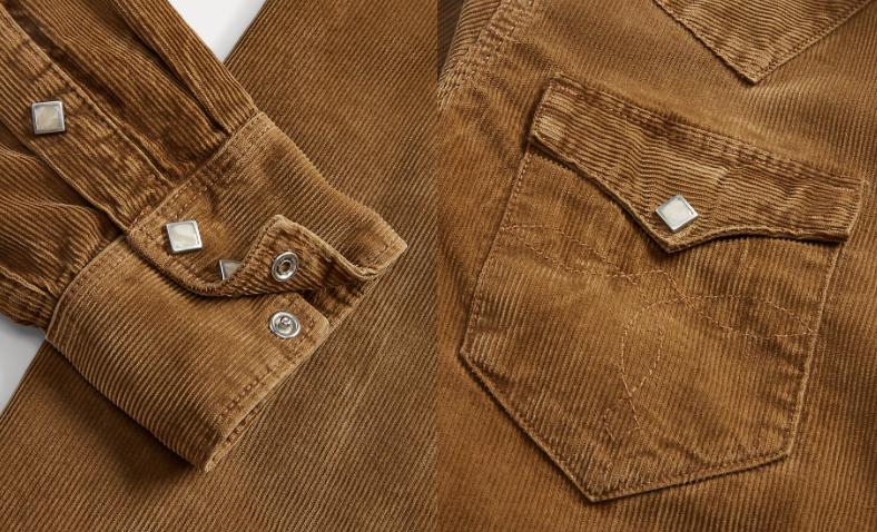 Slim-fitting Western shirt made with fine-wale corduroy from France. Metal button at the collar. Heavily laundered for a uniquely timeworn look and feel. Diamond-shaped snaps.