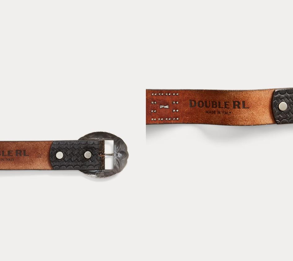 Made in Italy from vegetable-tanned leather. Embossed basket-weave patterns. Silver-tone brass hardware. Custom buckle. Silver-tone brass studs and glass crystals at the strap. Based on motorcycle belts from the ’50s.