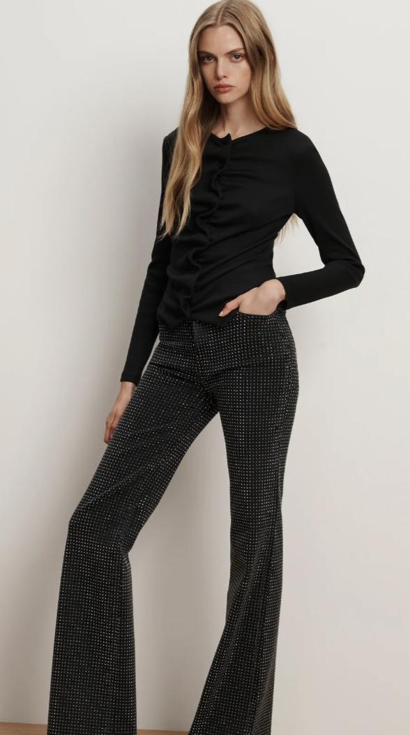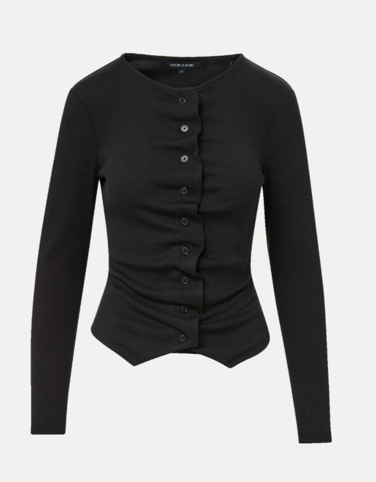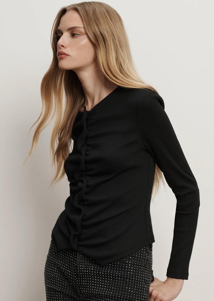 The classic long-sleeve tee—with a feminine twist. Crafted from black stretch cotton, the Jasminah top features a button-front silhouette that’s intentionally ruched to create an accordion-like effect, adding texture and depth. Long sleeves and a split hem complete the design. Perfect for elevating any day look—style with VB denim for off-duty polish or with wide-leg trousers for the office.