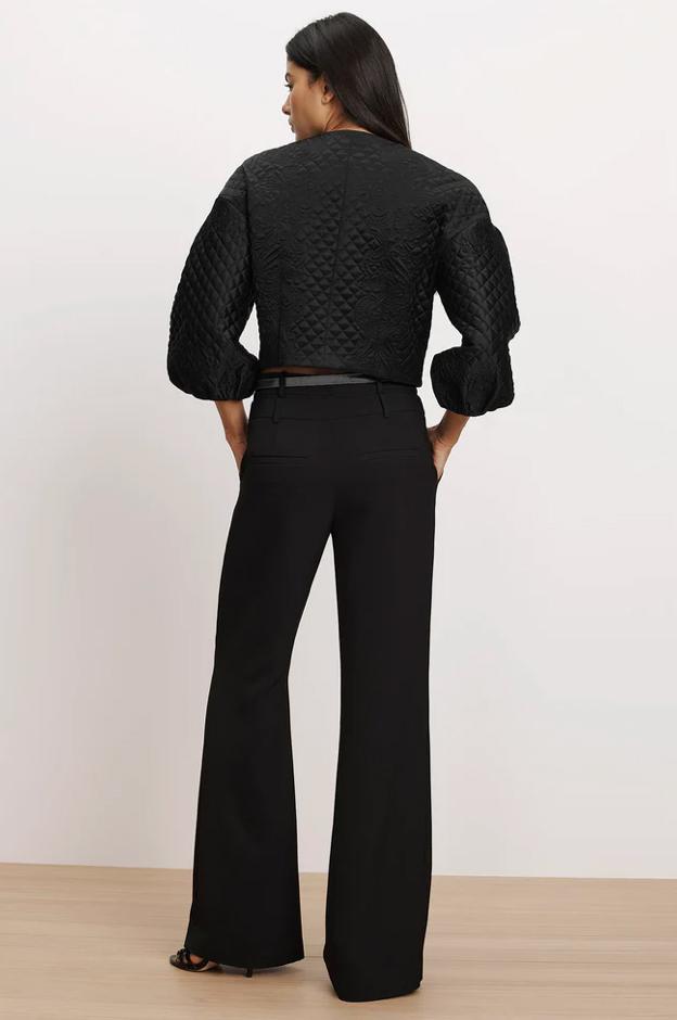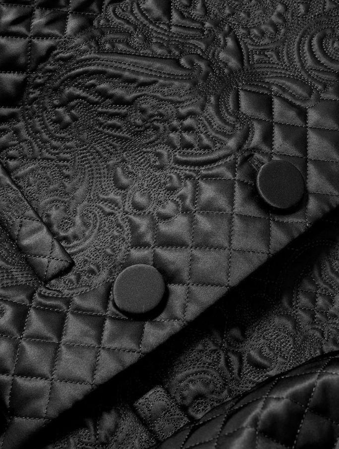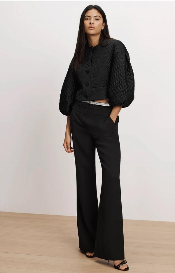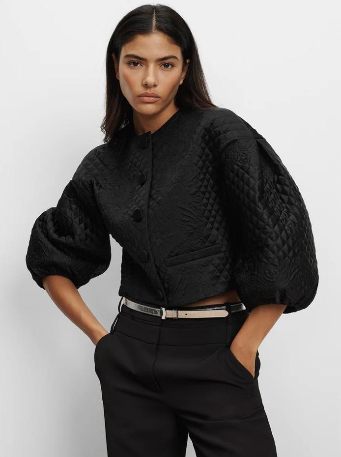 A jacket that makes an entrance. Crafted from smooth, subtly lustrous tailoring fabric, the Drake jacket is defined by intricate allover diamond-and-floral quilting. Voluminous balloon sleeves balance its cropped, collarless silhouette for dramatic effect. Front welt pockets and self-covered buttons complete the look. Style with a slim, black pant for an elegant, modern finish.
