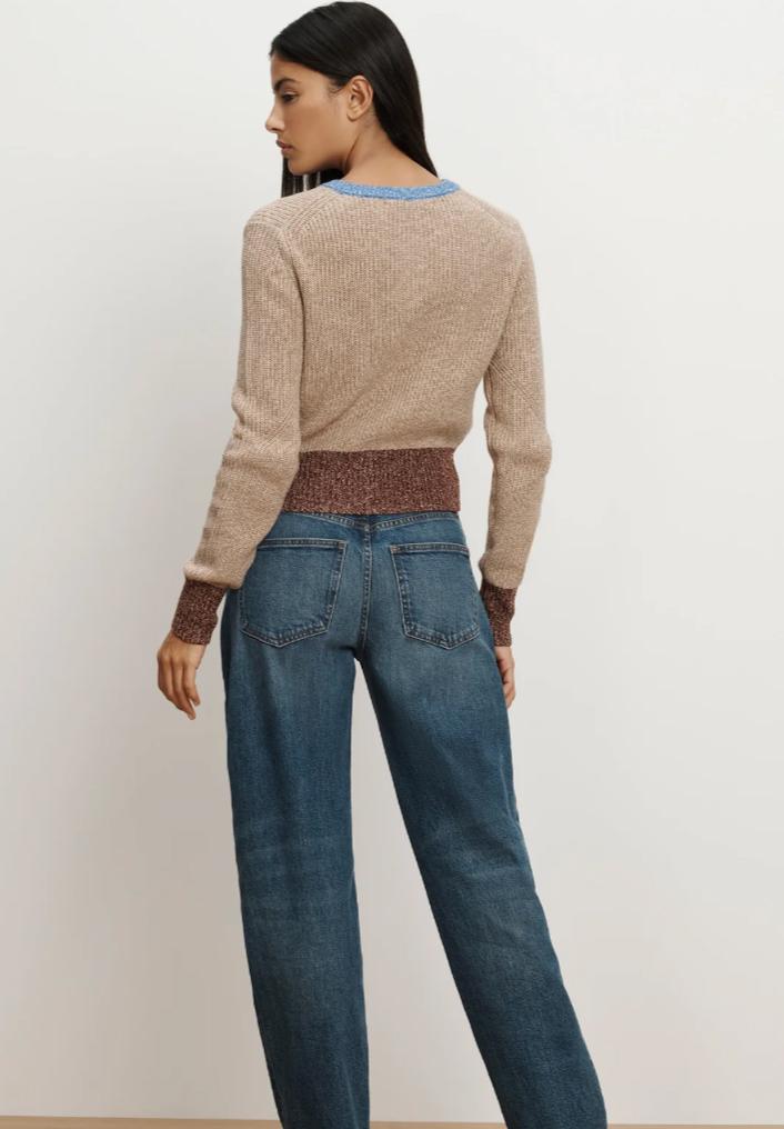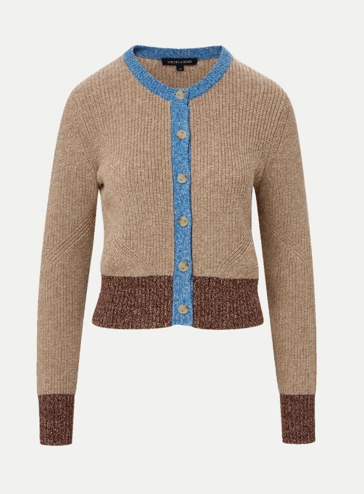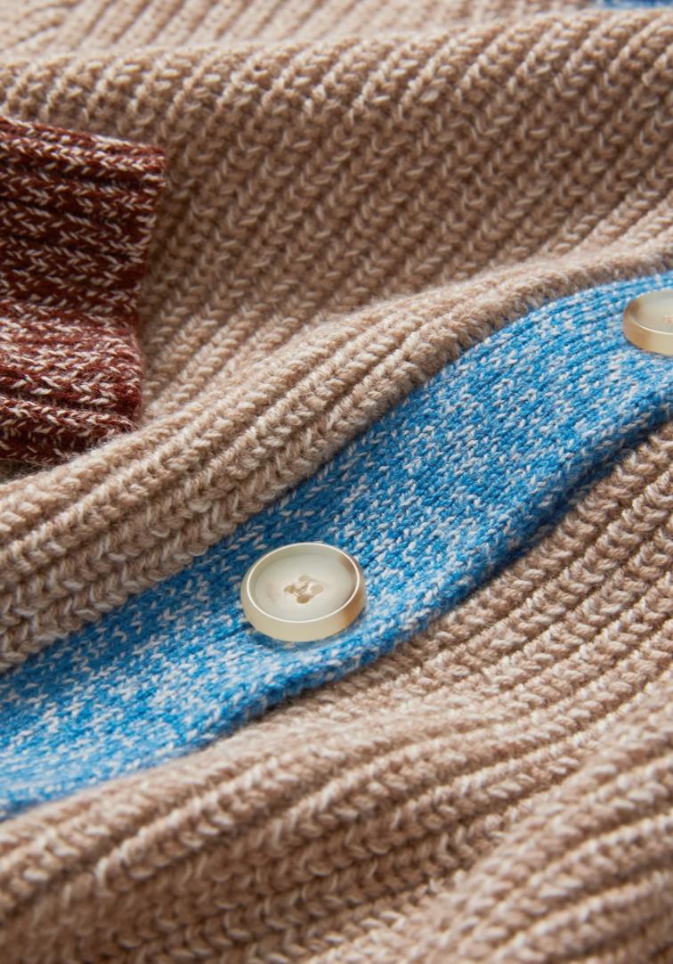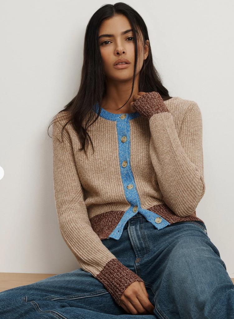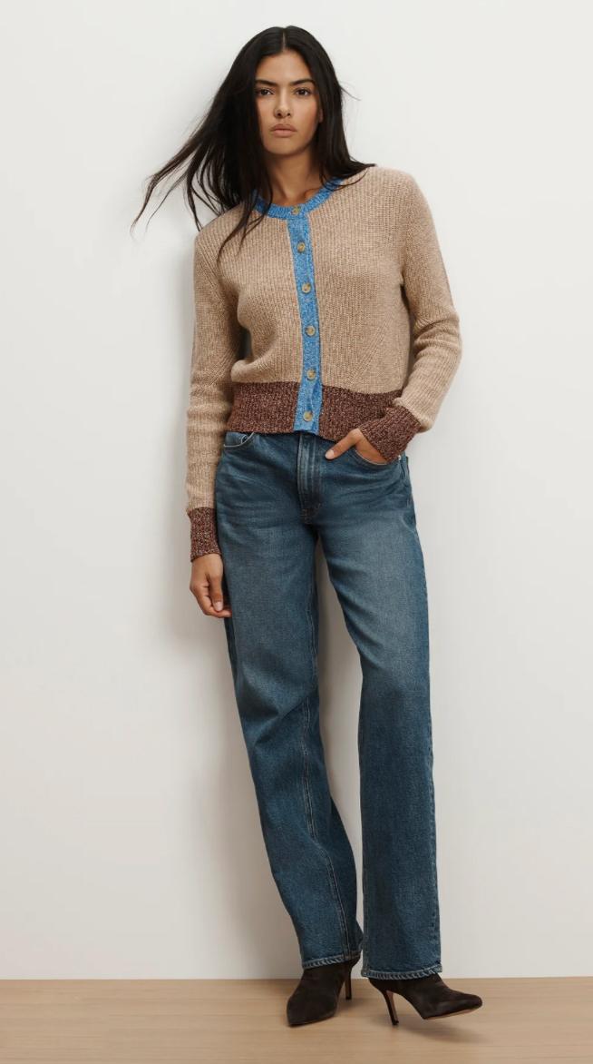 The essential knit for transitional styling. Spun from a premium merino-wool blend in beige, the Ibra cardigan features a slouchy, relaxed fit with soft ribbing throughout. Contrasting brown hem and cuffs and a pop of blue trim complete the look, lending a modern, color-blocked finish. Wear it solo or layered over a T-shirt, and pair with your favorite VB denim.