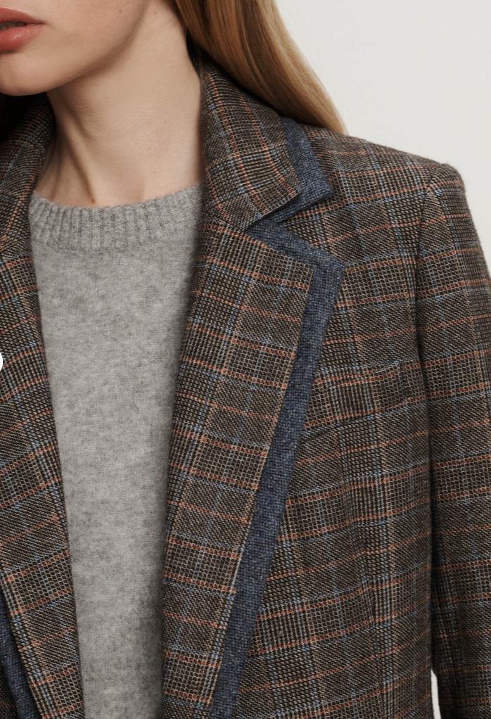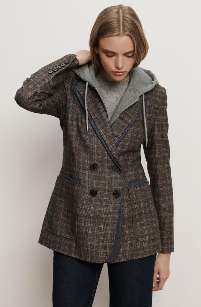 A suiting staple—with an unexpected twist. The Hedi dickey jacket is expertly crafted from an Italian tailoring blend in grey plaid. Cut for a boxy, oversized fit, it features a classic notch lapel—double layered in contrast birdseye tweed. Matching welt pockets and a double-breasted closure complete the look. Zip in a dickey and pair with tailored trousers or dark-wash denim for a polished, modern finish.