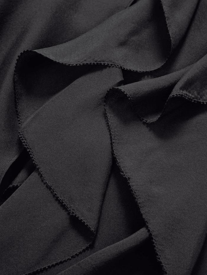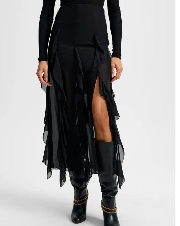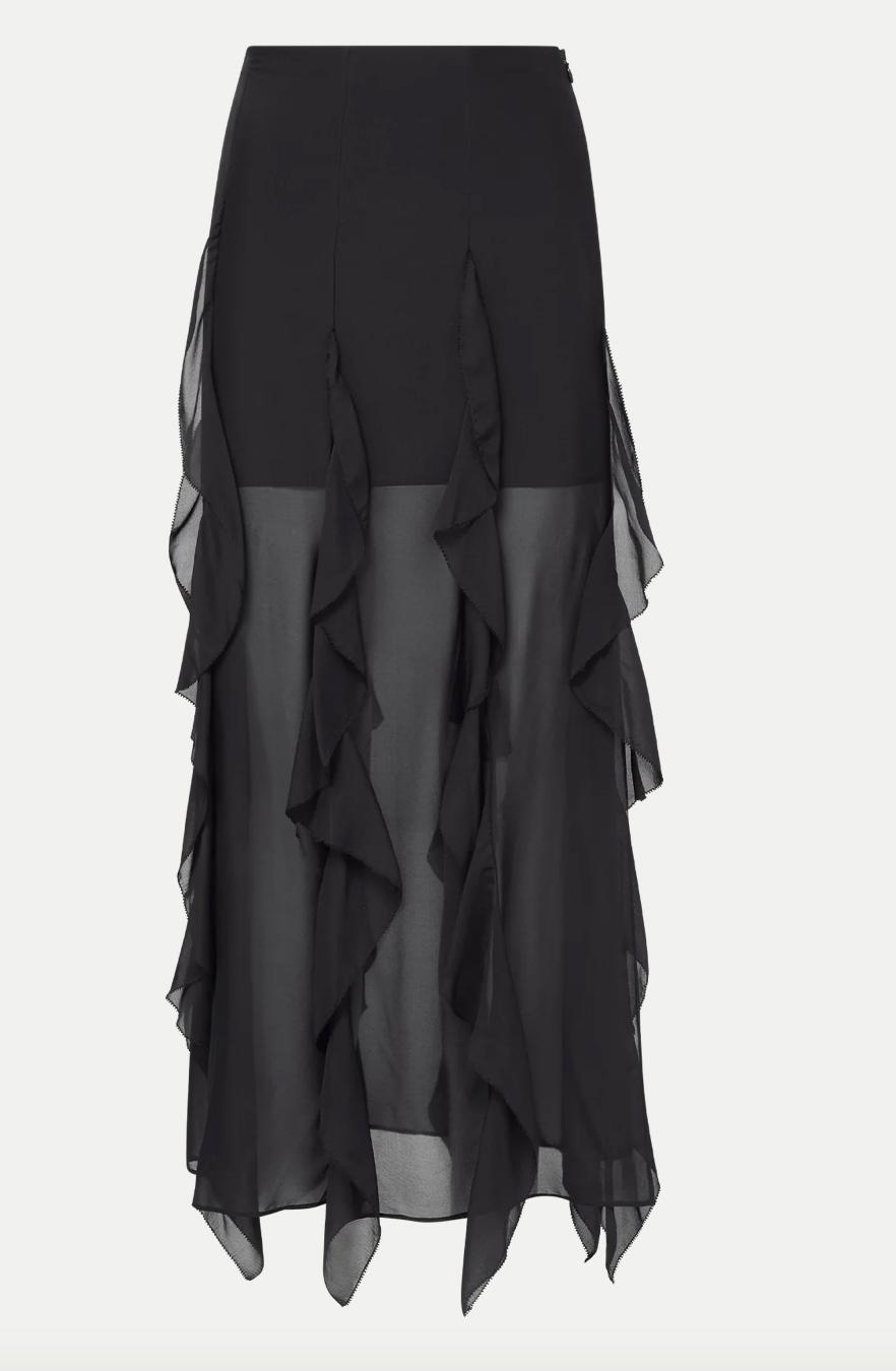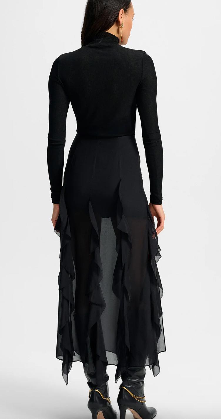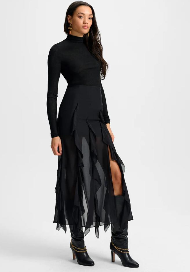 The perfect blend of romance and drama. Crafted from sheer premium silk, the Ava features a cascading, ruffled maxi silhouette, complete with a built-in mini slip for ease. A handkerchief hem and front slit add movement and a flirty edge. Pair this black maxi skirt with a sleeveless turtleneck top for a sleek look, or layer under an oversized sweater for something more relaxed.
