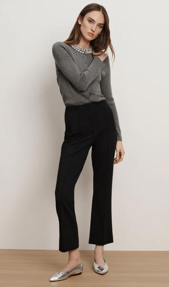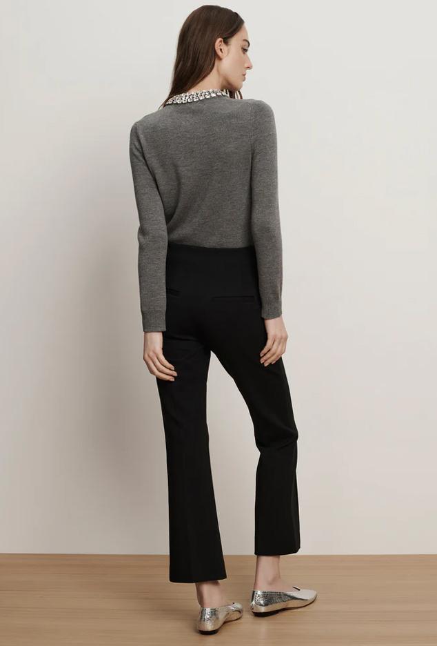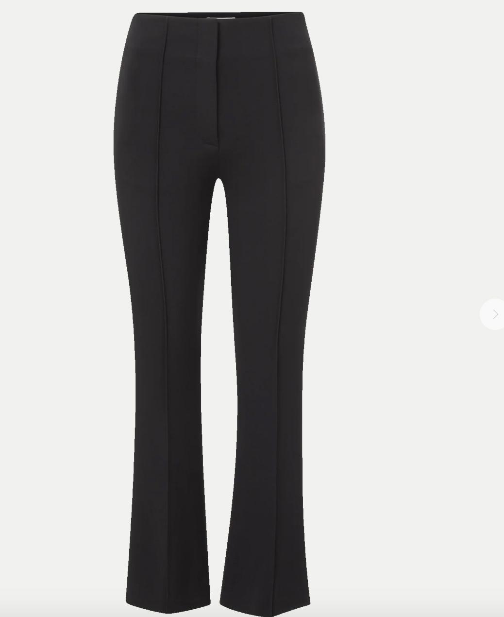 One of our best-selling silhouettes for a reason. Crafted from a premium stretch-blend in black, the Kean is a streamlined trouser with a slim leg and cropped, slightly flared hem. A high waist elongates the figure, finished with welt pockets for a tailored look. Pair this ankle-length pant with a cashmere sweater for a polished everyday look.