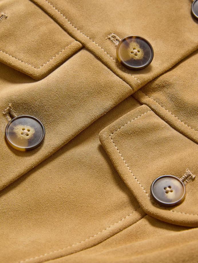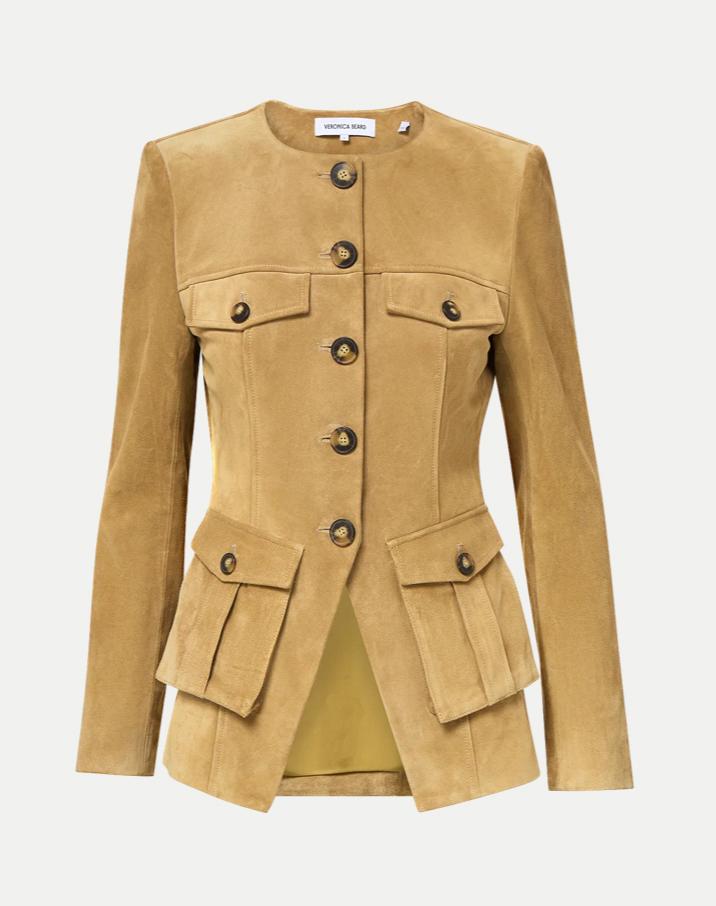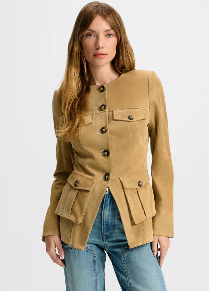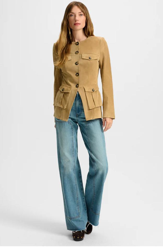 Sleek and polished, this jacket is slim-fitting, and elongated with a utilitarian edge. Crafted from butter-soft Italian calfskin, it features a collarless crew neckline, front flap pockets, and an angled cutaway hem for a lengthening effect. Style it closed as a top, or layer open over cotton tanks and lightweight knits.