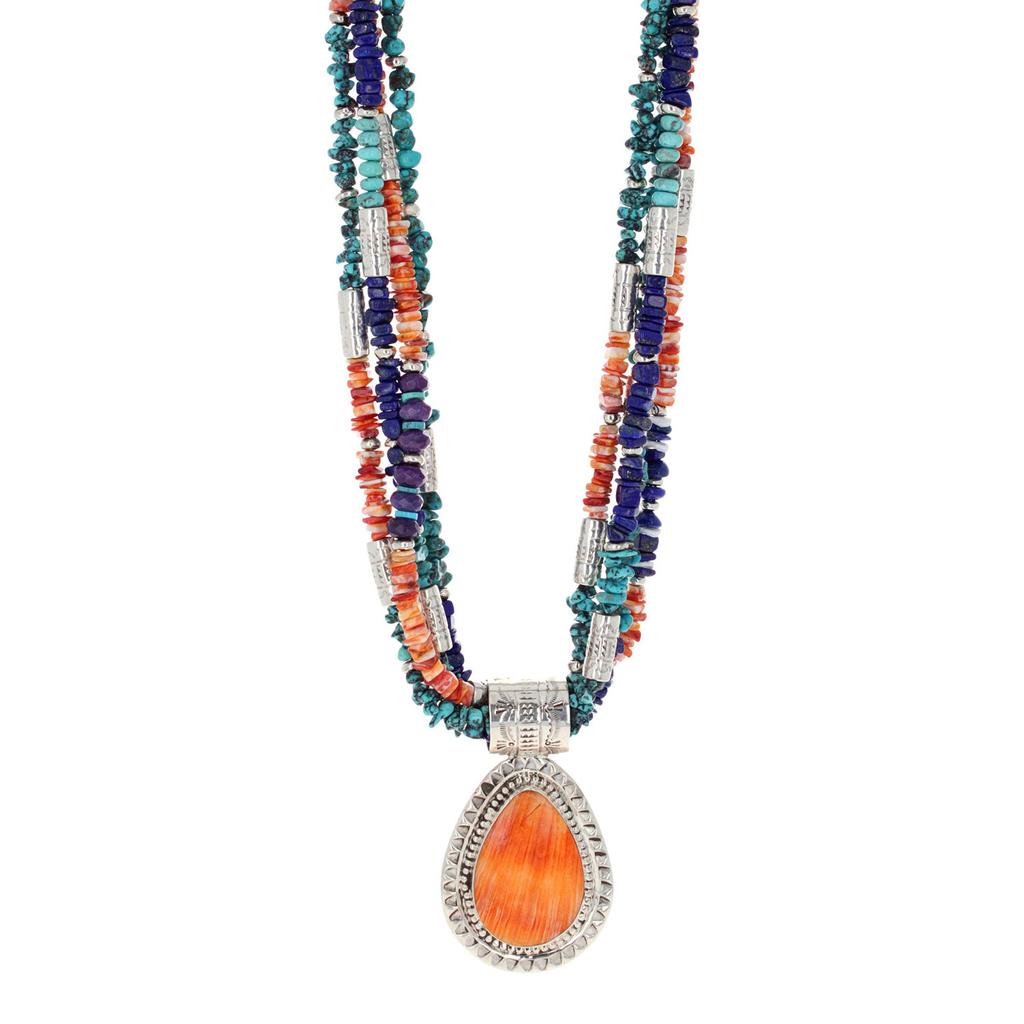 This necklace features Red/Orange Spiny Oyster, Sugilite, and Turquoise beads with alternating silver barrel stamped bead with a bezel set orange spiny oyster teardrop cabochon pendant with a hook and eye closure. The pendant is 1 1/2 inches and is 18 inches.